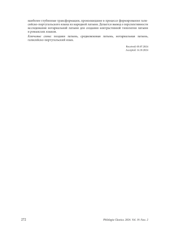 This piece studies the Portuguese version of the so-called Notarial Latin, the Latin of medieval documents. The author briefly overviews the reasons why these written records have been scarcely explored — the low availability of texts, the unreliability of existing editions and the perception of Notarial Latin as a corrupted language. The chronological framework of Notarial Latin, its correlation with Late and Medieval Latin and its sociolinguistic peculiarities are described. It is suggested to primarily focus on the morphosyntax of Notarial Latin. The results of the analysis of eighteen texts created between 1033 and 1183 are then presented followed by the analysis of various deviations from the grammatical norm of Latin caused by the interference of Galician-Portuguese. In nominals, there is a violation of the norms for the use of some prepositions (foremost, the preposition de). The case system generally remains. In the verb system, the regular use of Latin Futurum II in the function of the Portuguese Futuro de Conjuntivo which developed on its basis is evident. However, contrary to expectations, there are practically no traces of Romance verb analyticity. On the syntactic level, there is a tendency towards the SVO word order. The frequent cases of Romance interference indicate supposedly the most profound transformations that took place during the formation of Galician-Portuguese from vernacular Latin. It is concluded that the study of Notarial Latin is promising for a contrastive typology of Latin and Romance languages