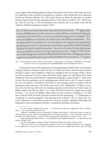“Bibliotheca universalis” (1545) by Conrad Gessner, which laid the foundation for the European bibliography of printed books and universal bibliography in general,1 and is mainly characterized by the reliability of information (including references to the sources used), begins with a bibliographical mishap. The preface to the book, which takes the form of a dedicatory letter (epistola nuncupatoria), contains a false attribution of an aphorism by Flavius Claudius Julianus (331–363), better known as Julian the Apostate, to another Roman emperor and a Greek-speaking author as well, Marcus Aurelius 2 (121–180) (Gessner 1545, 6a: see Fig. 1). This circumstance was noted by me in an earlier work but left without a detailed explanation (Sergeev 2021)