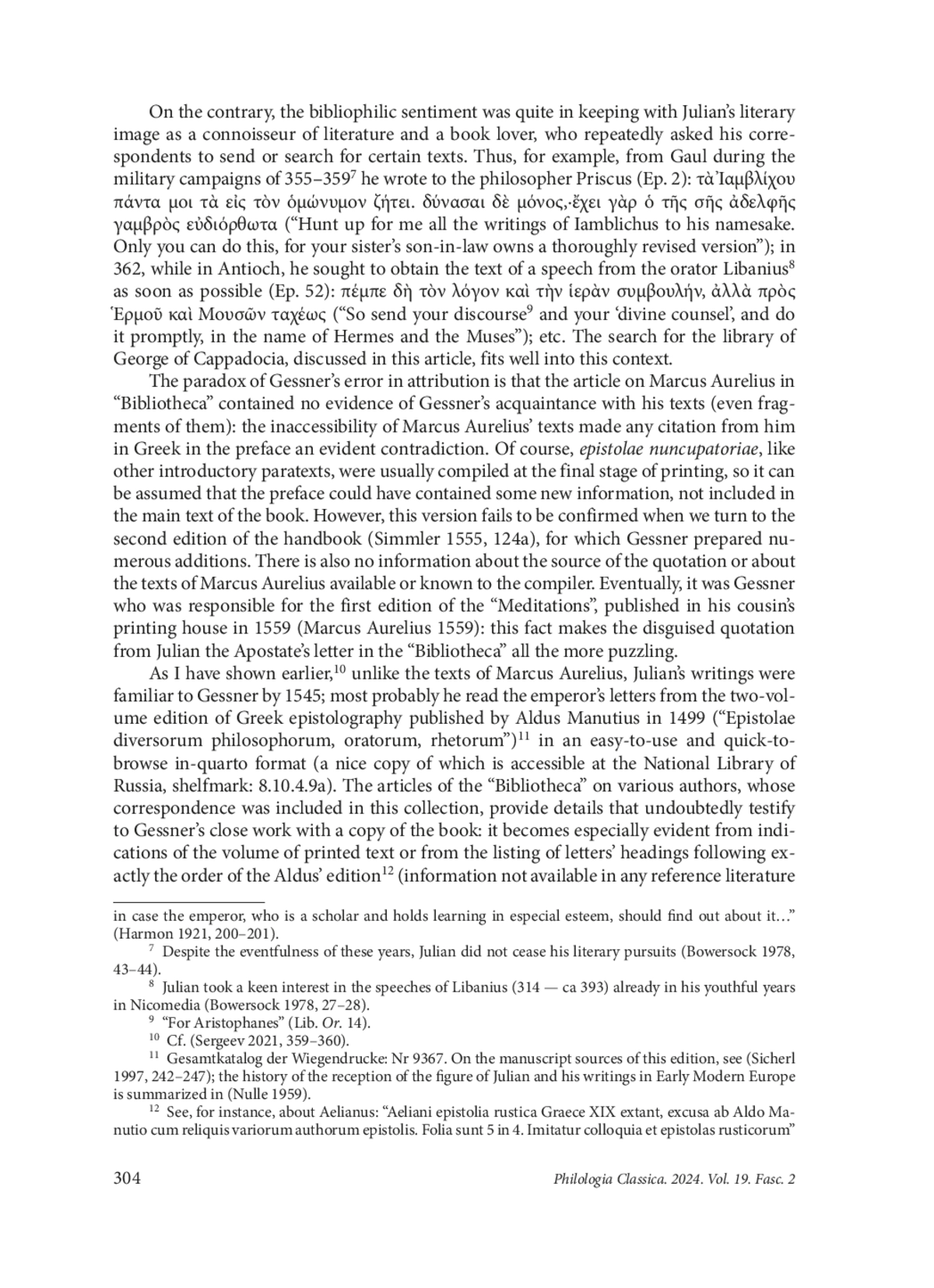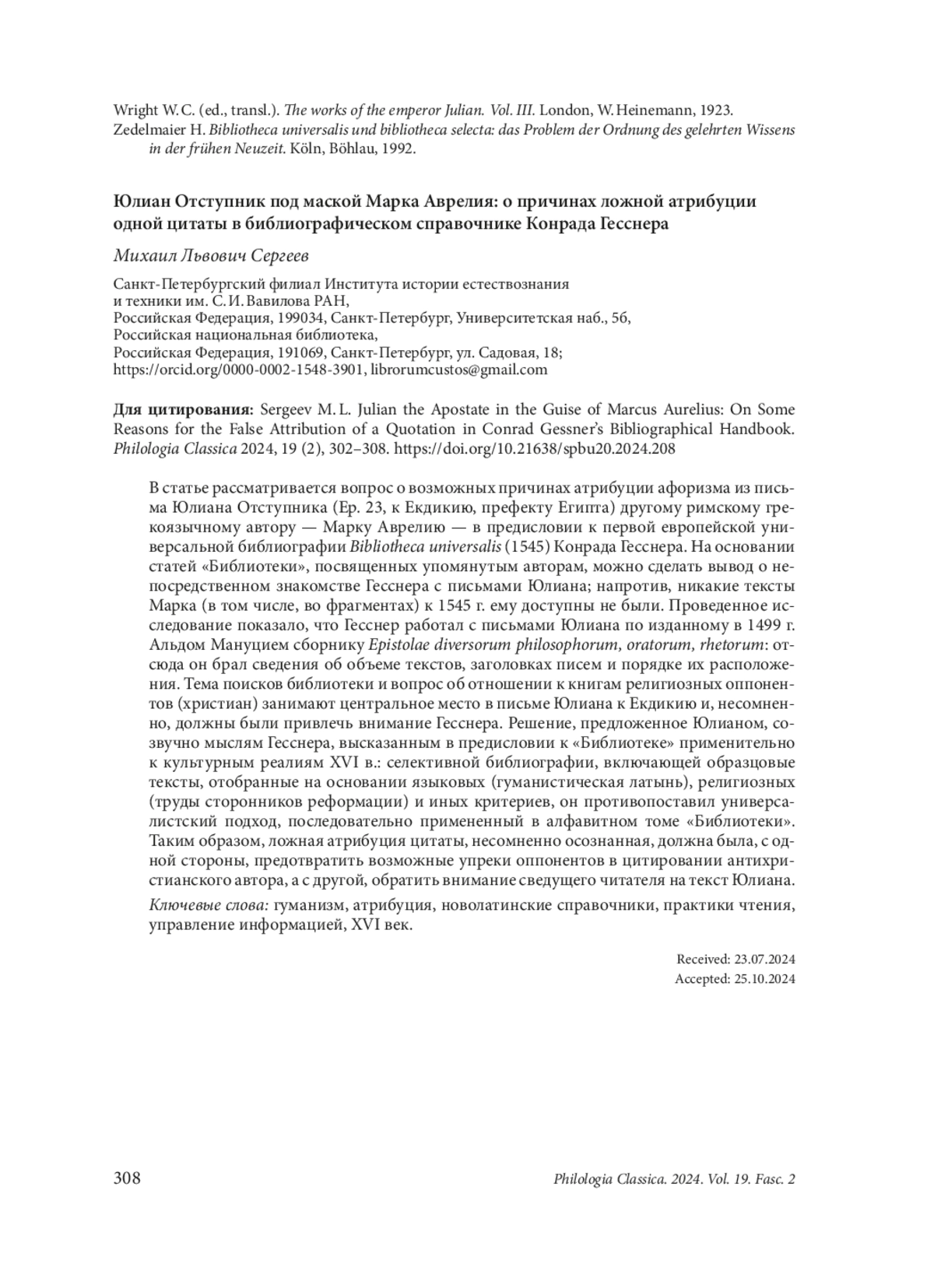 This article deals with the question of possible reasons for Conrad Gessner quoting an aphorism from Julian the Apostate’s letter (Ep. 23, to Ecdicius, prefect of Egypt) under the name of Marcus Aurelius in the preface to his Bibliotheca universalis, the first European universal bibliography (1545). Basing on the articles in Bibliotheca devoted to the above-mentioned authors, we can conclude that Gessner was directly acquainted with Julian’s letters (he obviously relied on the collection of Greek letters published by Aldus Manutius in 1499 under the title Epistolae diversorum philosophorum, oratorum, rhetorum), whereas no texts of Marcus (including fragmentary ones) were available to him by 1545. The topic of the search for a library and the question of how to treat the books written by religious opponents, which occupy a central place in Julian’s letter to Ecdicius, must have attracted Gessner’s attention, especially since the solution proposed by Julian turned out to be consonant with Gessner’s thoughts expressed in Bibliotheca. Thus, the false attribution of the quotation, undoubtedly deliberate, was, on the one hand, to prevent possible reproaches from conservative readers for quoting an anti-Christian author, and, on the other hand, to draw attention of a competent reader to Julian’s text