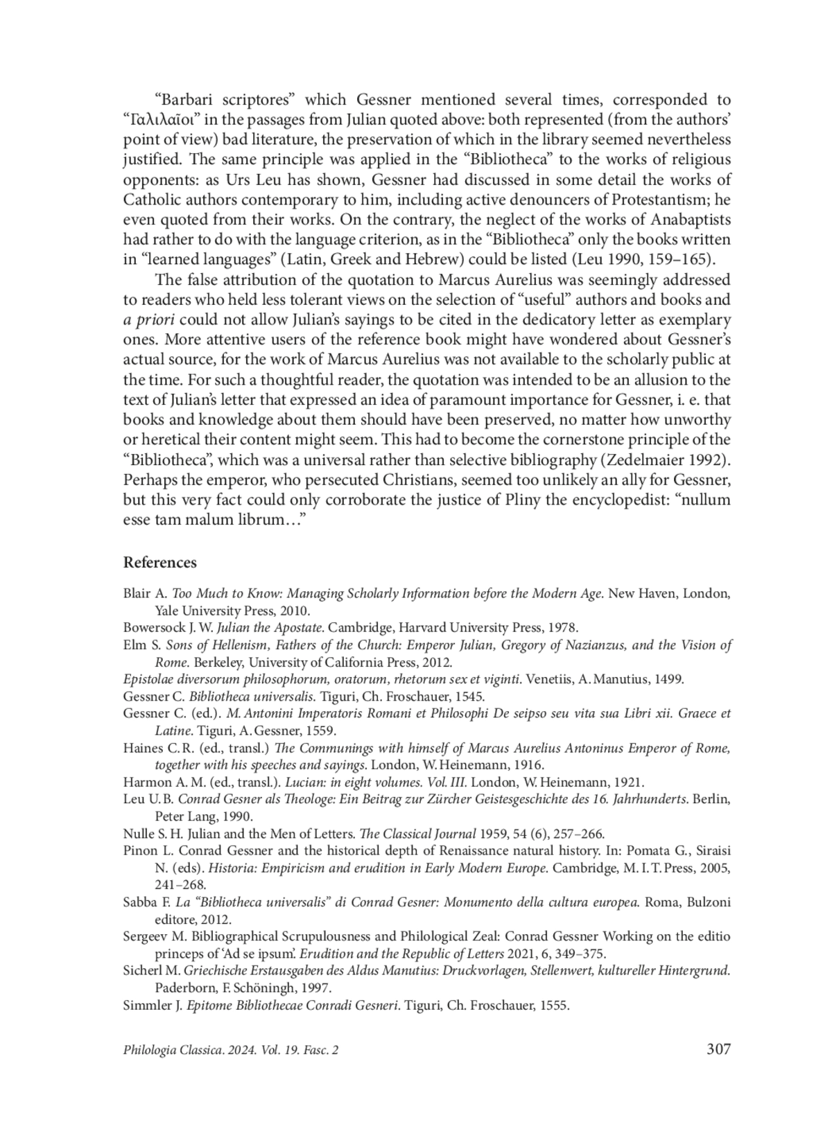 13. Sergeev M. Bibliographical Scrupulousness and Philological Zeal: Conrad Gessner Working on the editio princeps of ‘Ad se ipsum’. Erudition and the Republic of Letters 2021, 6, 349-375. EDN: KUGNEN
