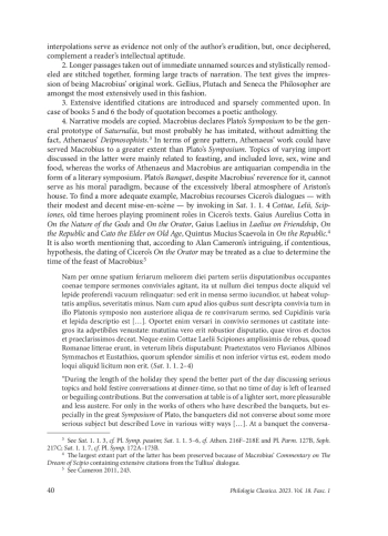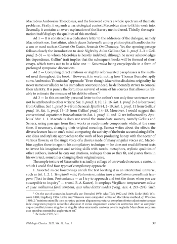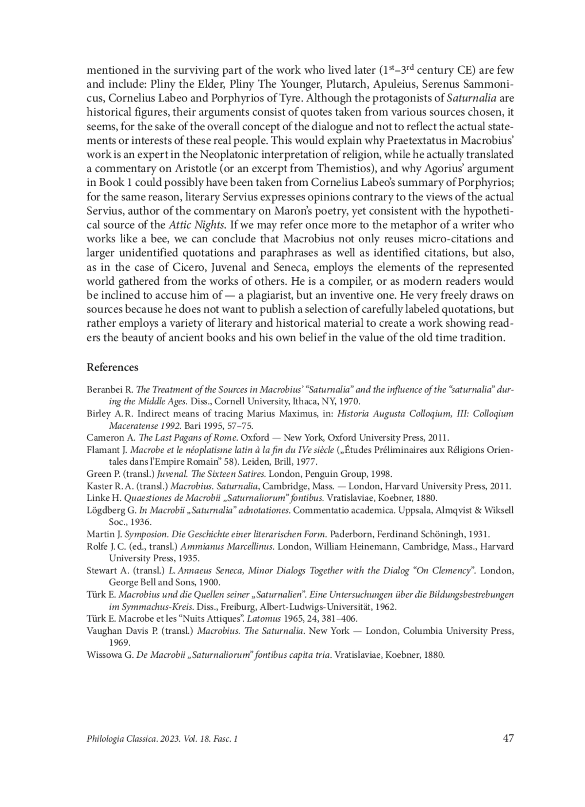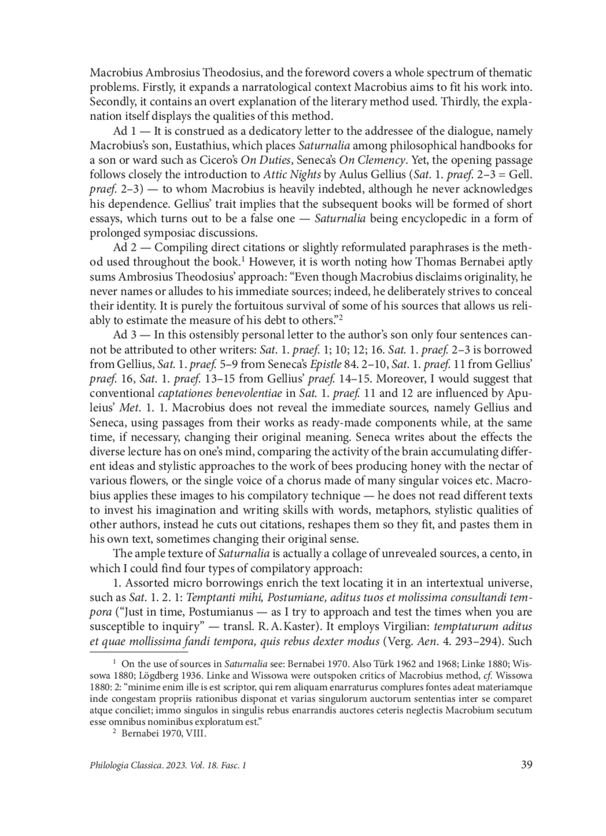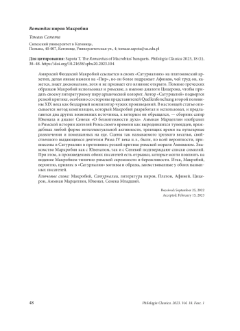 The preface to Saturnalia, together with chapter 1 of the first book, is a metafictional piece that stands apart from the core narration — a detailed seven-book long account of the learned disputes accompanying banquets held at the late Roman Empire elite houses during the Saturnalia festival. The preface’s narrator may be identified with the author, i. e. Macrobius Ambrosius Theodosius, and the foreword covers a whole spectrum of thematic problems. Firstly, it expands a narratological context Macrobius aims to fit his work into. Secondly, it contains an overt explanation of the literary method used. Thirdly, the explanation itself displays the qualities of this method
