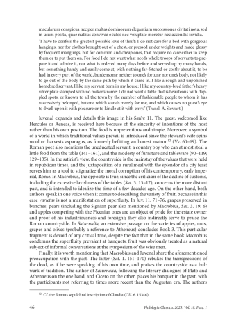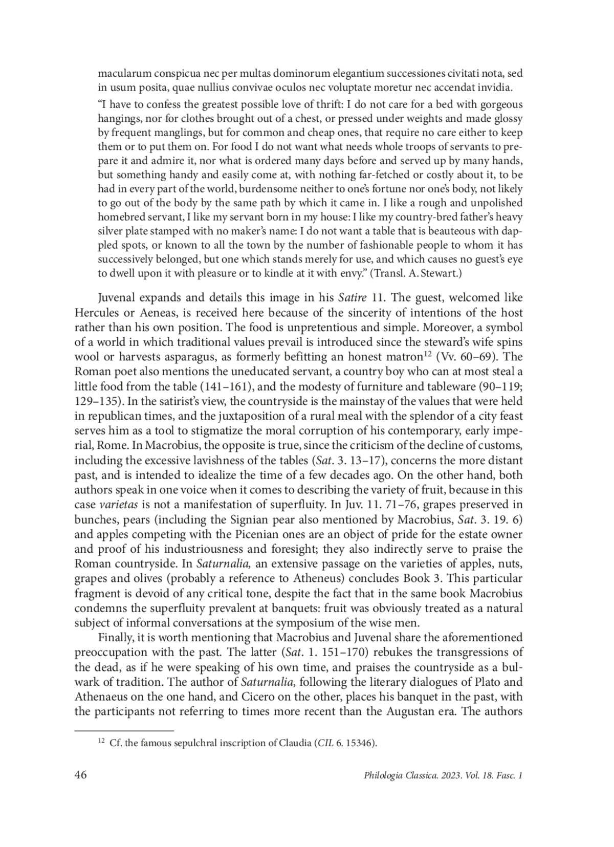 Macrobius Ambrosius Theodosius, in his Saturnalia, draws upon the Platonic archetype in making overt allusions to the Symposium and yet follows Athenaeus, whose work he seems to know thoroughly, albeit does not acknowledge its influence openly. Besides the Greek paradigms, Macrobius used Roman models, i. e., Cicero’s dialogues, to infuse his literary banquet with Roman flavour. The author of Saturnalia was severely criticised, especially by representatives of the Quellenforschung movement in the second half of the 19 th century, for allegedly being a poor plagiarist. His compilatory method is described in this article, and two other plausible Macrobius’ sources are proposed: Juvenal’s Satires and Seneca the Younger’s On Tranquility of the Mind. In Roman History Ammianus Marcellinus depicted the people inhabiting Rome of his times as degenerate parasites hostile to any form of intellectual activity who fritter away time on vulgar entertainment and obsessively overfeed themselves. Many scenes of so-called sober merriment shared by the prominent Roman personages of the IV c. AD were, in all probability, introduced to Saturnalia to counterbalance Ammianus Marcellinus’ harsh criticism of Roman morals. Macrobius’s familiarity with both Juvenal and Seneca manifests itself in the list of similes, yet, as the author of the present article proposes, there are passages in the oeuvre of both writers that may have instilled the vision of frugality typical of Romans in Macrobius’s mind, so that he may have used images borrowed from both earlier writers to Saturnalia