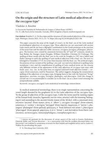In medical anatomical terminology, there is no single representation concerning the vowel length denoted by the grapheme ⟨e⟩ in the Latin adjectives of the coccygeus type. To the group of adjectives of the coccygeus type, I refer the terms used by naming organs of the human body (muscles, ligaments, nerves veins, arteries) with the meaning ‘belonging to’ and ascending to the ancient Greeks nouns of the 3d decl. with a consonant stem: anconeus ‘anconal’ (from ἀγκών, ῶνος, ὁ ̔elbow ̓), coccygeus ‘coccygeal’ (from κόκκυξ, κόκκυγος, ὁ ̔cockoo ̓), laryngeus ‘laryngeal’ (from λάρυγξ, λάρρυγγος, ὁ ̔larynx ̓), phalangeus ‘phalangeal’ (from φάλαγξ, φάλαγγος, ὁ ̔bone between two joints ̓), pharyngeus ‘pharyngeal’ (from φάρυγξ, φάρυγγος, ἡ or ὁ ̔throat ̓), and derivatives from them (subanconeus, sacrococcygeus, metacarpophalageus, craniopharyngeus etc.)