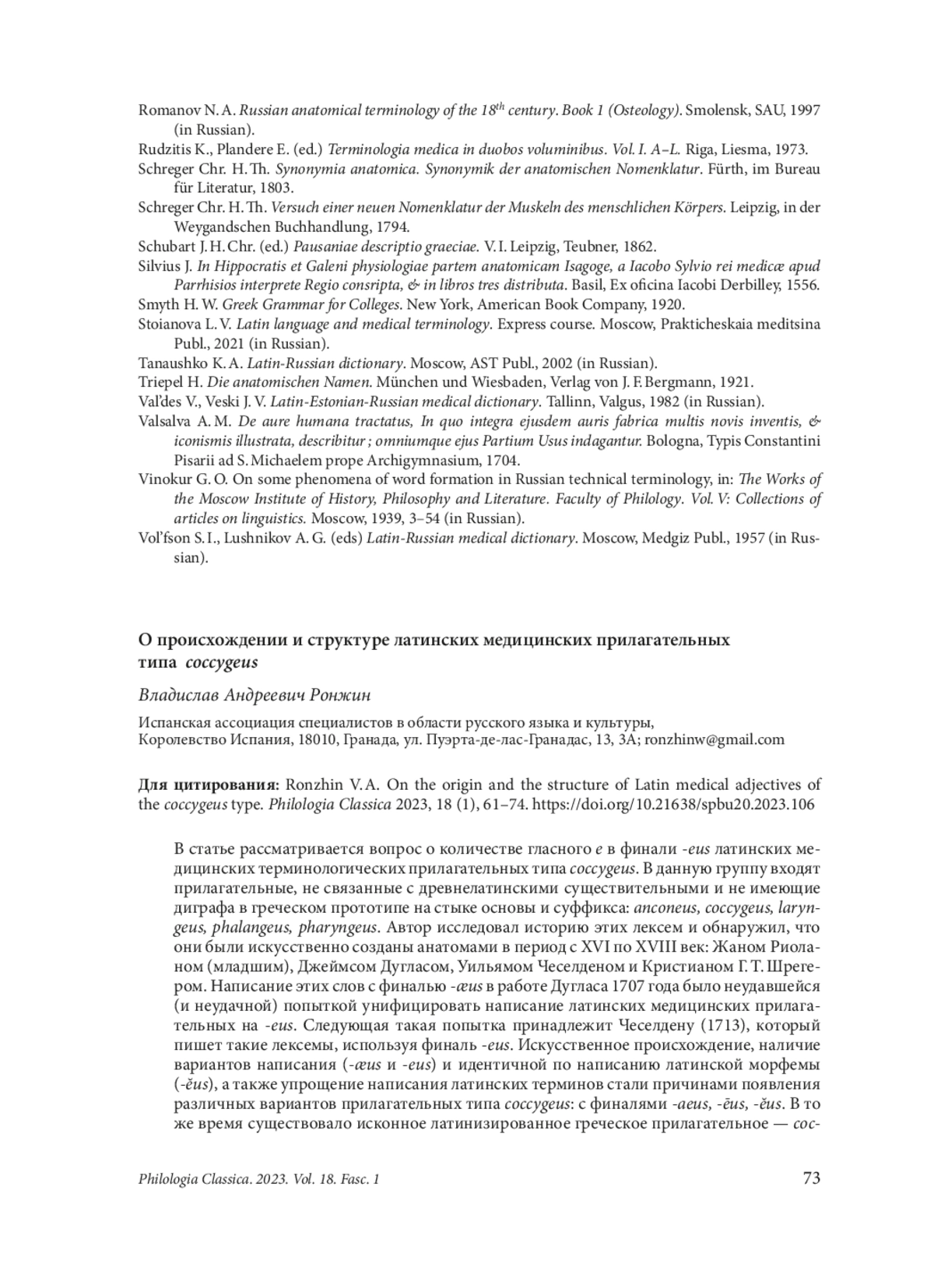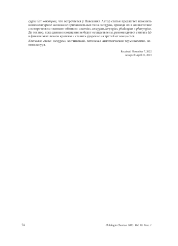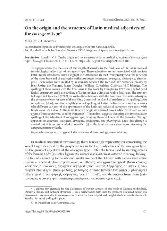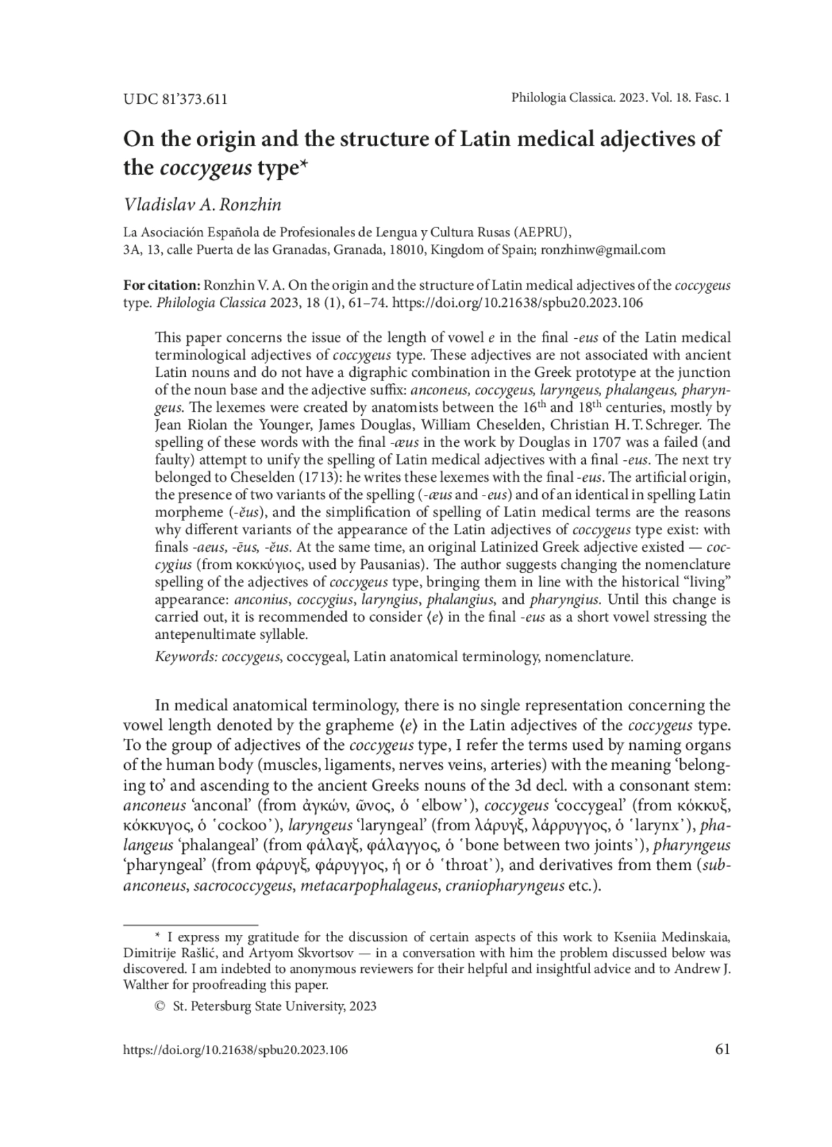 This paper concerns the issue of the length of vowel e in the final -eus of the Latin medical terminological adjectives of coccygeus type. These adjectives are not associated with ancient Latin nouns and do not have a digraphic combination in the Greek prototype at the junction of the noun base and the adjective suffix: anconeus, coccygeus, laryngeus, phalangeus, pharyngeus. The lexemes were created by anatomists between the 16th and 18th centuries, mostly by Jean Riolan the Younger, James Douglas, William Cheselden, Christian H. T. Schreger. The spelling of these words with the final -æus in the work by Douglas in 1707 was a failed (and faulty) attempt to unify the spelling of Latin medical adjectives with a final -eus. The next try belonged to Cheselden (1713): he writes these lexemes with the final -eus. The artificial origin, the presence of two variants of the spelling (-æus and -eus) and of an identical in spelling Latin morpheme (-ĕus), and the simplification of spelling of Latin medical terms are the reasons why different variants of the appearance of the Latin adjectives of coccygeus type exist: with finals -aeus, -ēus, -ĕus. At the same time, an original Latinized Greek adjective existed — coccygius (from κοκκύγιος, used by Pausanias). The author suggests changing the nomenclature spelling of the adjectives of coccygeus type, bringing them in line with the historical “living” appearance: anconius, coccygius, laryngius, phalangius, and pharyngius. Until this change is carried out, it is recommended to consider ⟨e⟩ in the final -eus as a short vowel stressing the antepenultimate syllable