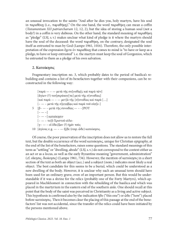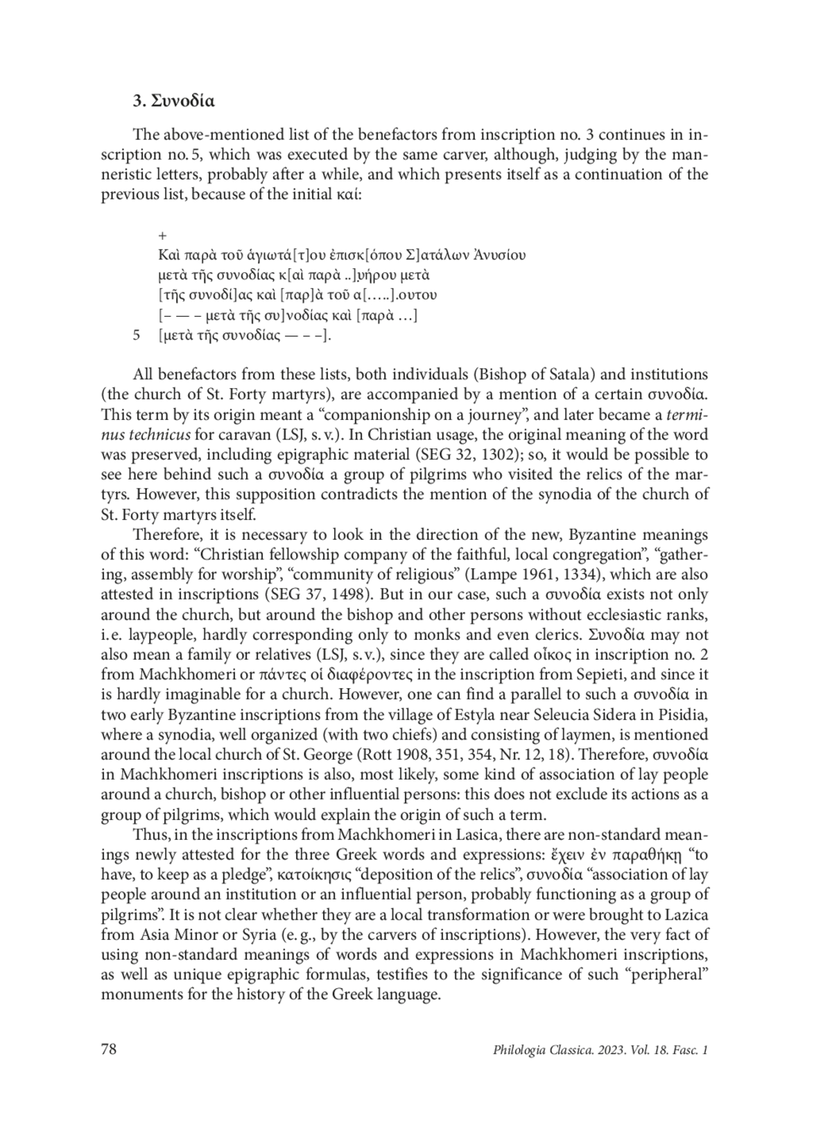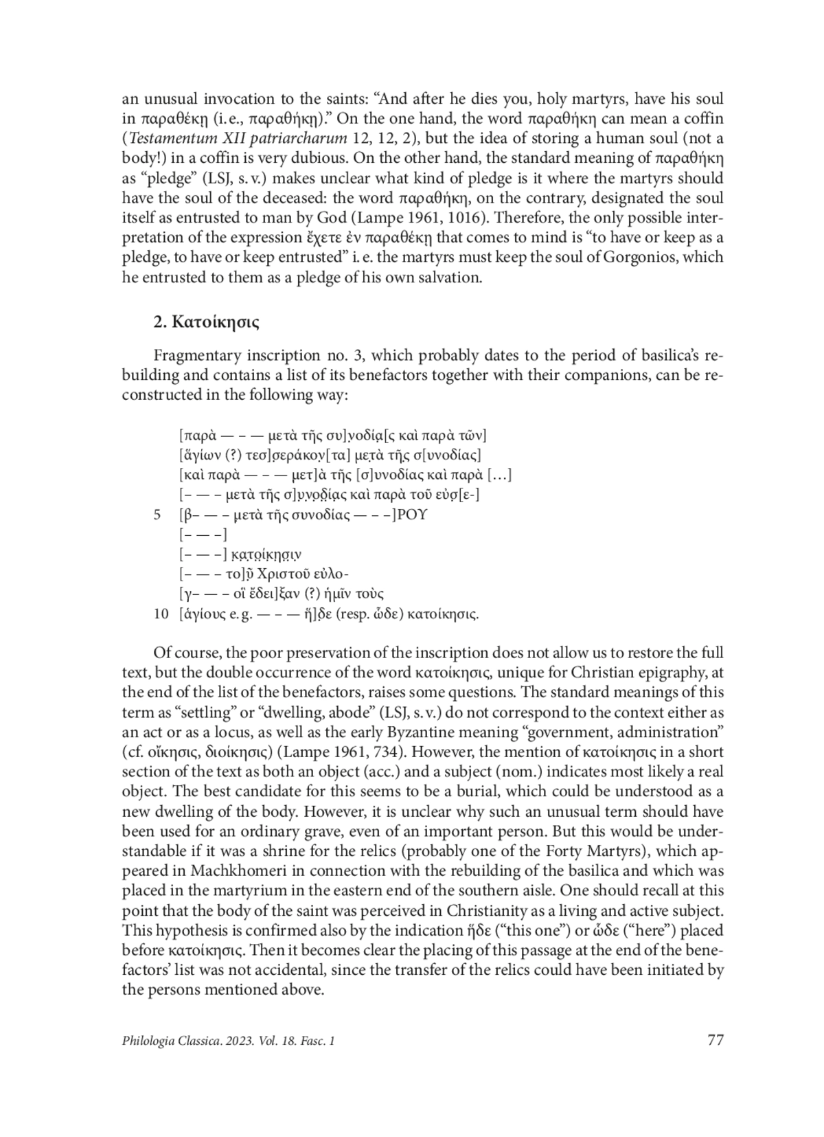 The author discusses the newly found Greek inscriptions from Lasica, from the basilica on Machkhomeri Hill near Khobi dated to the 6 th c. CE, with three Greek words and expressions having non-standard meanings. The only possible interpretation of the expression ἔχετε ἐν παραθέκῃ (sic) that comes to mind is “to have or keep as a pledge, to have or keep entrusted” i. e. the martyrs must keep the soul of the founder Gorgonios, which he entrusted to them as a pledge of his own salvation. The standard meanings of the term κατοίκησις as “settling” or “dwelling, abode” do not correspond to the context of the list of the benefactors either as an act or as a locus, as well as the early Byzantine meaning “government, administration”. It should mean here a burial, which could be understood as a new dwelling of the body or even a shrine for the relics (probably one of the Forty Martyrs), which appeared in Machkhomeri in connection with the rebuilding of the basilica and which was placed in the martyrium in the eastern end of the southern aisle. Finally, the term συνοδία by its origin meant a “companionship on a journey”, and later became a terminus technicus for caravan; new, Byzantine meanings of this word are “Christian fellowship company of the faithful, local congregation”, “gathering, assembly for worship”, “community of religious”. But here it is an “association of lay people around an institution or an influential person, probably functioning as a group of pilgrims”