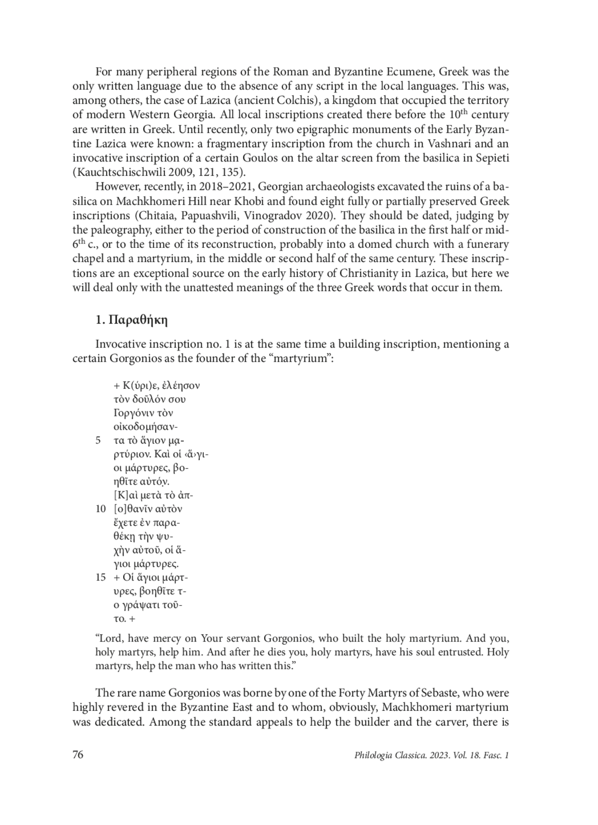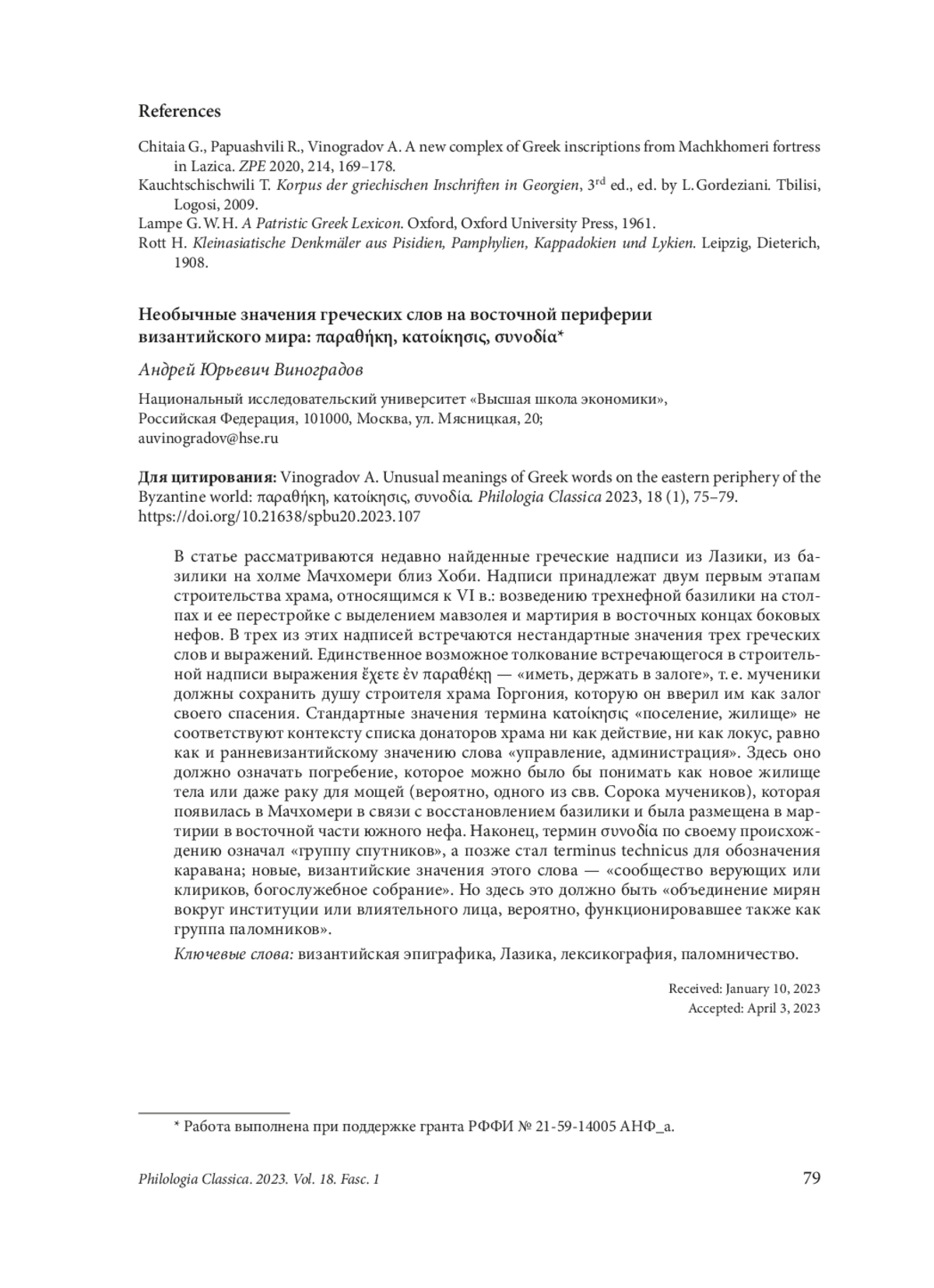 1. Chitaia G., Papuashvili R., Vinogradov A. A new complex of Greek inscriptions from Machkhomeri fortress in Lazica. ZPE 2020, 214, 169-178. EDN: FIKPBY