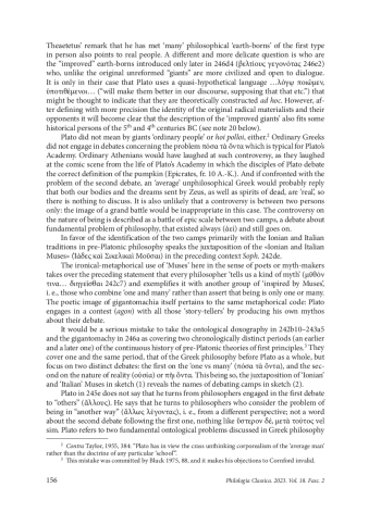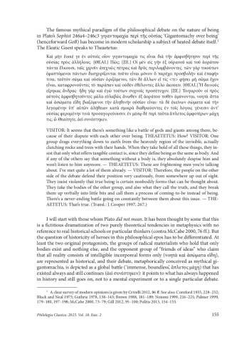 The famous mythical paradigm of the philosophical debate on the nature of being in Plato’s Sophist 246a4–246c3 γιγαντομαχία περὶ τῆς οὐσίας ‘Gigantomachy over being’ (henceforward GoB) has become in modern scholarship a subject of heated debate itself.1 The Eleatic Guest speaks to Theaetetus