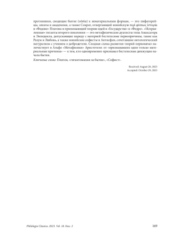 The mythopoetic parable of ‘Gigantomachia over being’ in Plato’s Sophist 246a4 ff. is neither a theoretical construction ad hoc of some general trends, nor a reference to a single contemporary debate, e. g., between Plato’s Academy and atomists in 4 th century BC. The controversy on the nature of being is described as a real battle on epic scale (ἄπλετος μάχη) between two camps, as a debate about fundamental problem of philosophy, that has always existed (ἀεὶ συνέστηκεν) and is still going on. In favor of the identification of the two camps primarily with the Ionian and Italian traditions in the pre-Platonic philosophy speaks the juxtaposition of the ‘Ionian and Italian Muses’ (Ἰάδες καὶ Σικελικαὶ Μοῦσαι) in the preceding context Soph. 242de. The ‘unreformed giants’ are the Ionian physikoi from Anaximander to Democritus, while their ‘divine’ adversaries, who reduce being (ousia) to immaterial forms, are the Pythagoreans, Eleatics and Platonists, as well as Socrates, who dismisses the Ionian περὶ φύσεως ἱστορία in Plato’s Phaedo and who upholds the theory of ideas in the Republic and Phaedrus. The ‘improved’ giants of the second generation are metaphysical dualists like Anaxagoras and Empedocles who admit incorporeal causes like Mind and Love alongside with matter, as well as Heraclitus, the Ionian Sophists and Antisthenes who combined ontological naturalism with teaching arete. The general scheme of the development of theories of archai in Aristotle’s Metaphysics is very similar: from those who recognized only material causes to those who admitted incorporeal moving cause (Anaxagoras and Empedocles).