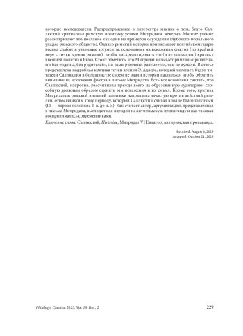According to the author of the article, Mithridates VI Eupator’s letter to the Parthian monarch Arsaces in Sallust’s Historiae does not reproduce the genuine document from the personal archives of the Pontic king as some researchers believe. The opinion that Sallust criticized Roman politics under Mithridates’mask is rejected; many scholars consider this letter to be a condemnation of deep moral decline of the Roman society. On the contrary, the Roman writer attributes to the Pontic king the weak and vulnerable arguments based on the false facts (at least from the Roman point of view) to discredit his (and not only his) criticism of Roman foreign policy. He calls the Romans “strangers without a homeland, without parents”, but it is naturally that Romans themselves did not think in this way. The author objects to E. Adler, who believes that most of Sallust’s readers did not know history well enough to mark the distortions of facts in Mithridates’ letter. There is every reason to believe that Sallust was counting on an educated public that would be able to appreciate these distortions and their meaning. The author thinks that Mithridates’ argumentation looks like a parody of the anti-Roman propaganda and it might have been perceived as such by Sallust’s readers.