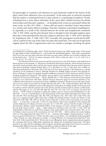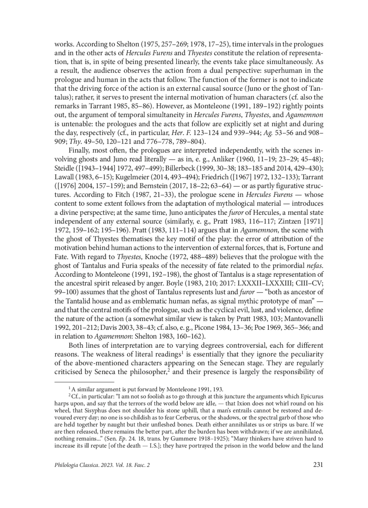 The prologues of Hercules Furens, Agamemnon, and Thyestes, three Senecan plays distinguished by the presence of a superhuman character on stage, are sometimes discussed together (all three or two of them) in general systematic overviews (cf., e. g., Tarrant [1976] 2004, 157; Calder III 1976, 29–30; Picone 1984, 15; Monteleone 1991, 190–191; Mazzoli 1998, 123–132; Boyle 2017, LXXIX–LXXXI; 100). Heldmann (1974, 1–62) addresses them in some more detail, focusing on the points of difference between these opening scenes and the prologues of Attic tragedies, such as lesser connection with the action, limited self-presentational and expository role (fulfilled only indirectly and occasionally), and the presence of introspection. Other approaches pay more attention to the similarities in the semantic structure of the two of the prologues. Following Poe (1969, 365), Paratore (1982, 226–234) refers to Furia from the prologue of Thyestes as a manifestation of the nature of Atreus — who internalised the spirit of Tantalus — and to Atreus and Aegistus, the heroes of Thyestes and Agamemnon, as characters possessed by family demons.