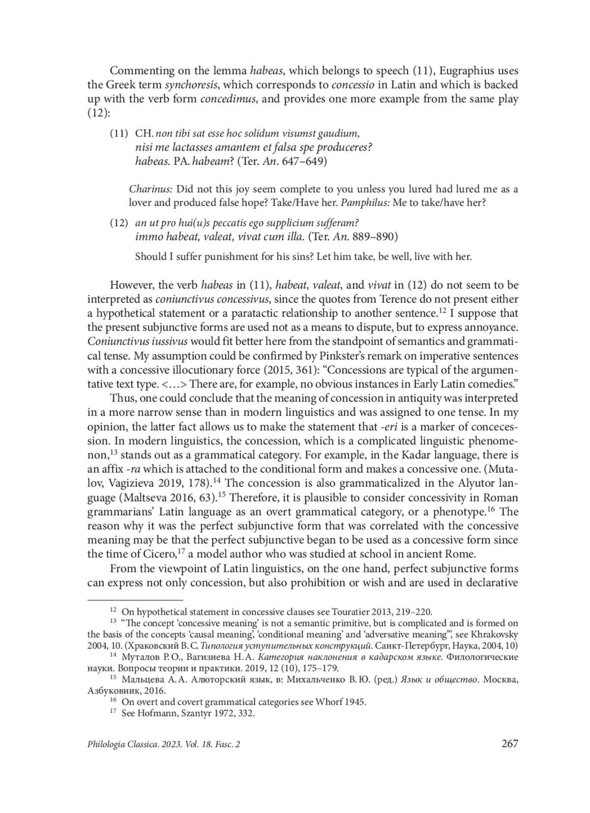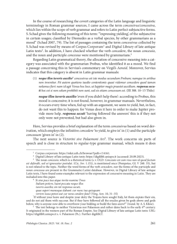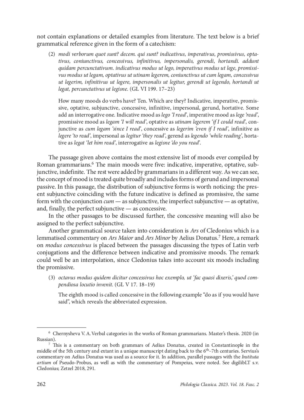 In the course of researching the covert categories of the Latin language and linguistic terminology in Roman grammar sources, I came across the term concessivus/concessiva, which lies within the scope of verb grammar and refers to Latin perfect subjunctive forms. S. Schad gives the following meaning of this term: “‘expressing yielding’, of the subjunctive in certain usages; classified by Diomedes as a verbal species, by other grammarians as a mood” (Schad 2007, 79). The list of passages containing the term concessivus collected by S. Schad was revised by means of Corpus Corporum 1 and Digital Library of late antique Latin texts2. In addition, I have checked whether the verb concedere, the noun concessio, and the noun and participle concessus were mentioned by grammarians