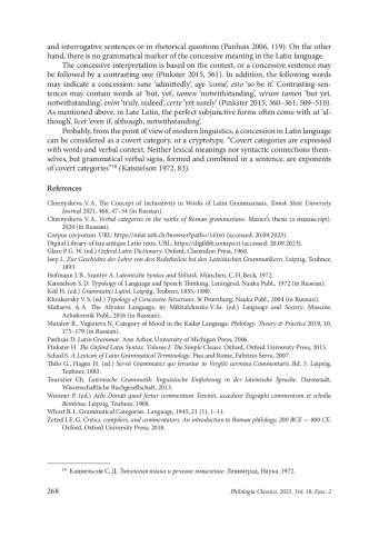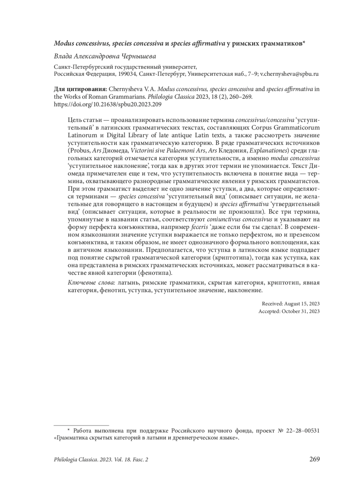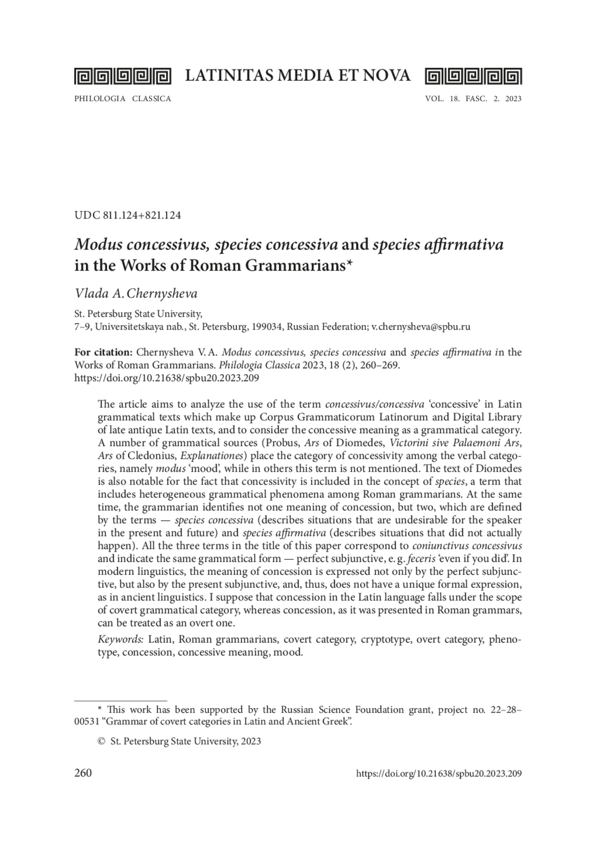The article aims to analyze the use of the term concessivus/concessiva ‘concessive’ in Latin grammatical texts which make up Corpus Grammaticorum Latinorum and Digital Library of late antique Latin texts, and to consider the concessive meaning as a grammatical category. A number of grammatical sources (Probus, Ars of Diomedes, Victorini sive Palaemoni Ars, Ars of Cledonius, Explanationes) place the category of concessivity among the verbal categories, namely modus ‘mood’, while in others this term is not mentioned. The text of Diomedes is also notable for the fact that concessivity is included in the concept of species, a term that includes heterogeneous grammatical phenomena among Roman grammarians. At the same time, the grammarian identifies not one meaning of concession, but two, which are defined by the terms — species concessiva (describes situations that are undesirable for the speaker in the present and future) and species affirmativa (describes situations that did not actually happen). All the three terms in the title of this paper correspond to coniunctivus concessivus and indicate the same grammatical form — perfect subjunctive, e. g. feceris ‘even if you did’. In modern linguistics, the meaning of concession is expressed not only by the perfect subjunctive, but also by the present subjunctive, and, thus, does not have a unique formal expression, as in ancient linguistics. I suppose that concession in the Latin language falls under the scope of covert grammatical category, whereas concession, as it was presented in Roman grammars, can be treated as an overt one