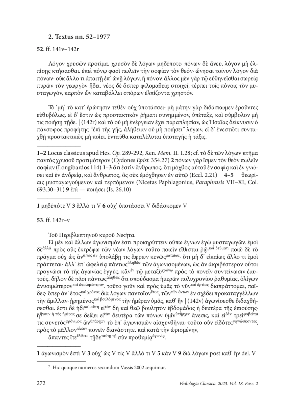 5. Vassis Io. Τῶν νέων φιλολόγων παλαίσματα: Ἡ συλλογὴ σχεδῶν τοῦ κώδικα Vaticanus Palatinus gr. 92. Ἑλληνικά 2002, 52, 37-68.