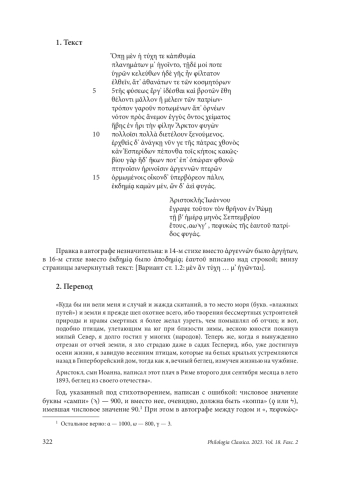 Цель настоящей статьи — познакомить читателей с греческим стихотворением Вячеслава Иванова (1866–1949), до сих пор не публиковавшимся. Греческие опыты Иванова уже становились предметом научного внимания (Ермолаева 2019; Ermolaeva 2020), а публикуемое стихотворение примечательно тем, что относится к раннему периоду творчества поэта. Текст стихотворения, публикуемый ниже, представлен автографом с незначительной правкой, который хранится в личном фонде Вяч. Иванова в Российской государственной библиотеке среди разрозненных записей на древнегреческом языке (ОР РГБ. Ф. 109, карт. 4, ед. хр. 59. Л. 2)