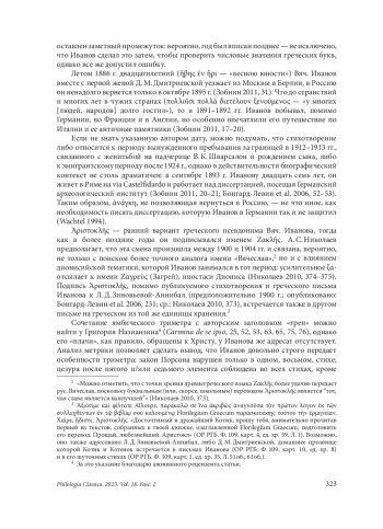 4. Ермолаева Е. Л. Греческое послание Вяч. Иванова Г. А. Рачинскому. Philologia Classica 2019, 14 (1), 121-130. EDN: TOWRUU