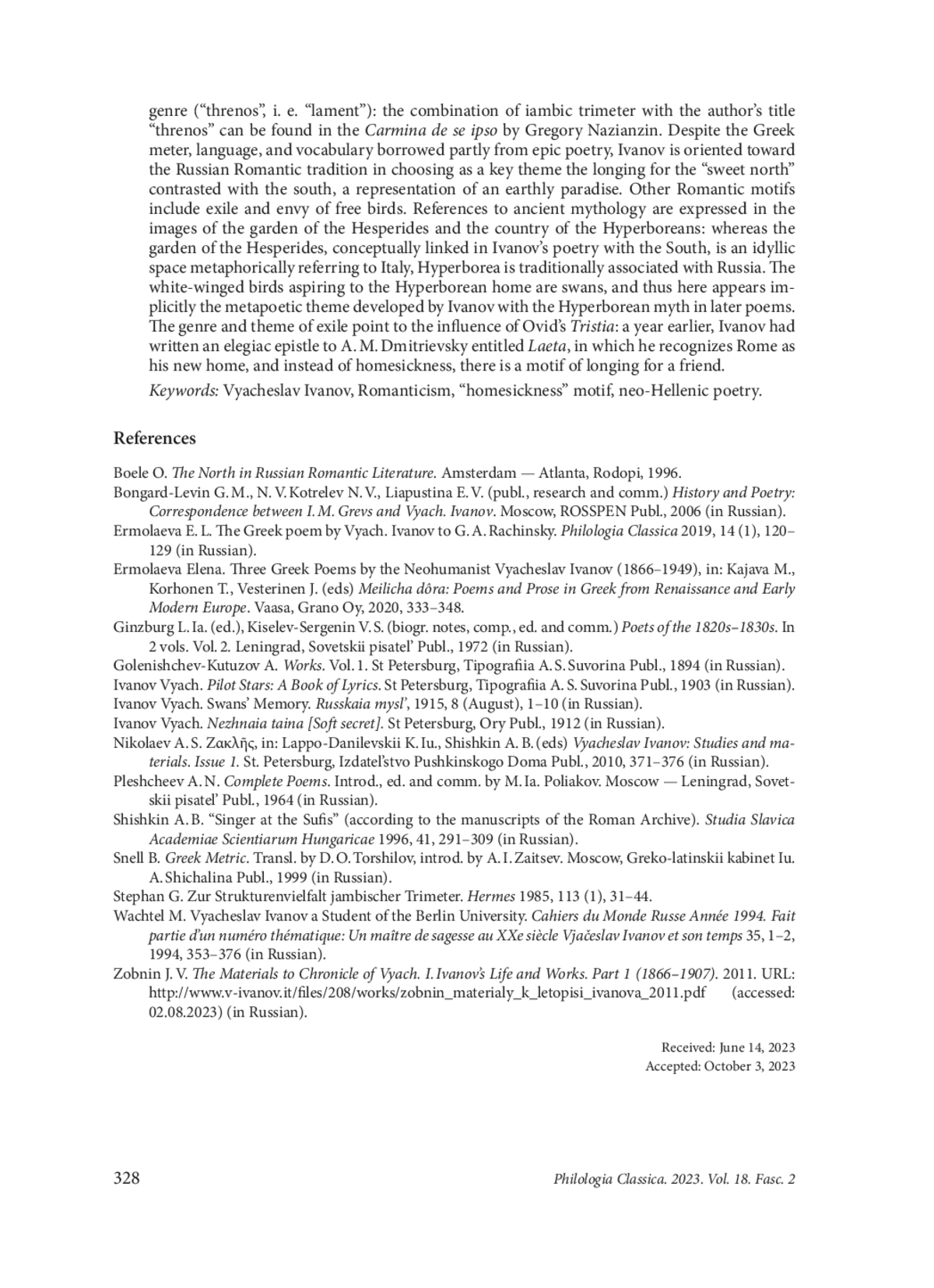 14. Ermolaeva Elena. Three Greek Poems by the Neohumanist Vyacheslav Ivanov (1866-1949), in: Kajava M., Korhonen T., Vesterinen J. (eds) Meilicha dôra: Poems and Prose in Greek from Renaissance and Early Modern Europe. Vaasa, Grano Oy, 2020, 333-348.