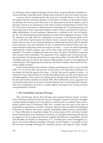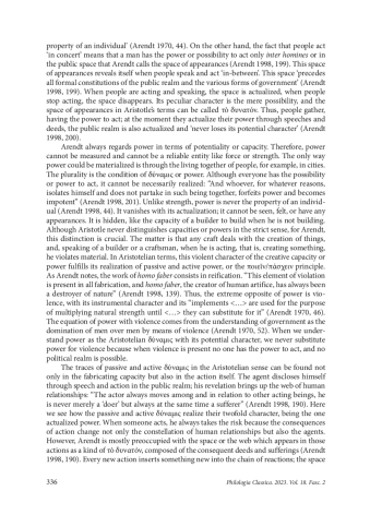 Hannah Arendt, an outstanding twentieth-century political philosopher, was known to be passionate about antiquity and its high political realm under the name of πόλις. In contrast to the modern society of apolitical human beings, πόλις was seen by Arendt as an organization where people could exercise their freedom by acting together. “To be political, to live in a πόλις meant that everything was decided through words and persuasion and not through force and violence” (Arendt 1998, 26). The capacity to act in a political realm like πόλις was distinguished by Arendt as power which she derives from the Aristotelian conception of δύναμις.