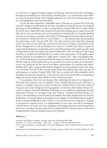 Hannah Arendt, one of the most significant political and philosophical intellectuals of the 20th century, frequently brought up the issue of power. In The Human Condition, to distinguish power from force, strength, and, particularly, violence, she pointed out that the word ‘power’ had been derived from the Aristotelian conception of δύναμις. Since Arendt had written about power as the capacity to act together in the political realm, her understanding of the term δύναμις was credited to Aristotle. In order to make the distinction between power and its extremity, that is, violence, in Arendt’s theory more comprehendible, it is crucial to examine the Aristotelian conception of the term δύναμις and its original definitions, which are mostly found in Metaphysics. This paper aims to provide a philosophical analysis of δύναμις in Aristotle to clarify Arendt’s notion of power as well as her theory of action. In the first part of the article, the author discusses the word δύναμις which had a variety of meanings in antiquity including power, potentiality, potency, capacity, possibility, and force. Unlike common meanings, Aristotle used the word δύναμις in its relation to the term ἐνέργεια, which were usually translated as ‘potentiality’ and ‘actuality’. Aristotle defined δύναμις as the principle of change, that is, the power or capacity to act and be affected, which reveals itself when it achieves its fulfilment, or ἐνέργεια. In the second part, the author demonstrates that Arendt’s concept of power is based on the Aristotelian δύναμις as the power to act together, which cannot be stored up and exists only in its actualization. The author concludes by saying that power in the Aristotelian sense cannot be substituted for violence but instead manifests itself in the ability to be a political human being