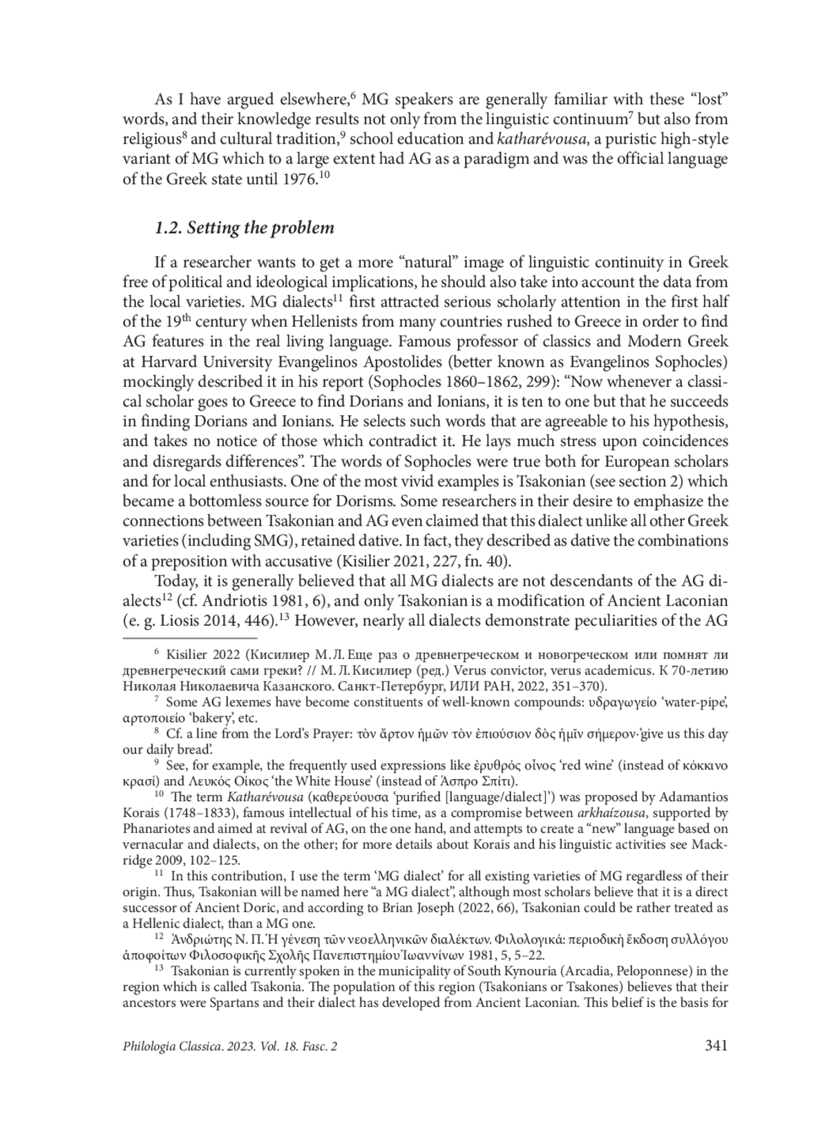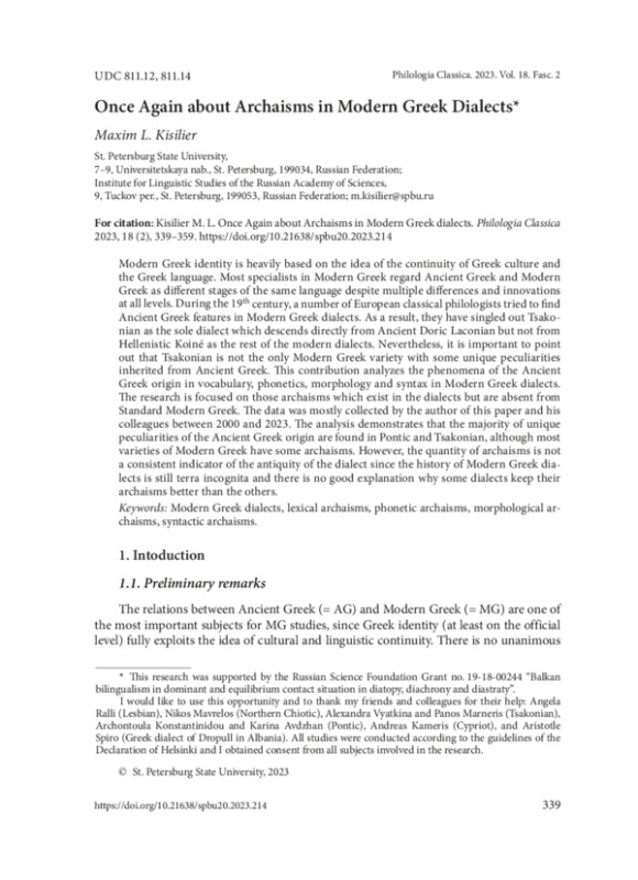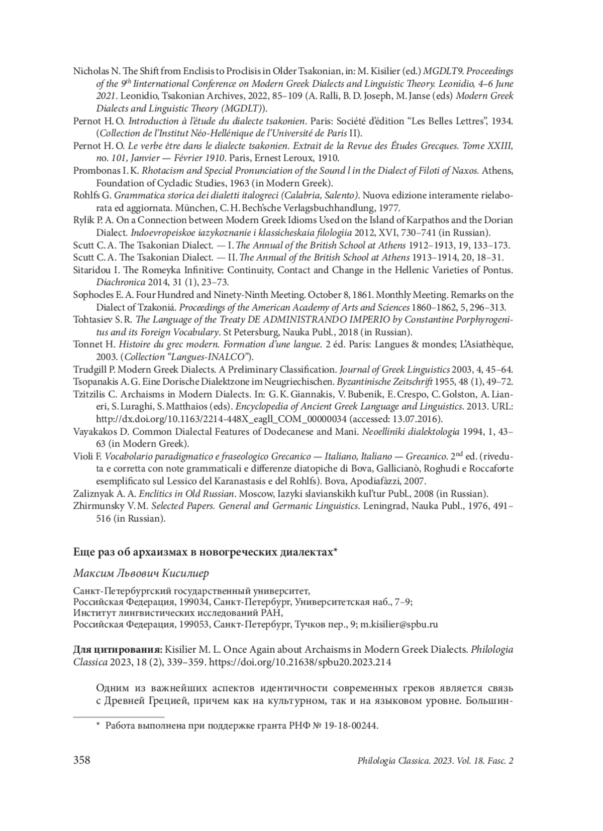 28. Kisilier M. L., Fedchenko V. V. Some Remarks on Archaic Phenomena in Modern Greek Dialects. Indoevropeiskoe iazykoznanie i klassicheskaia filologiia 2015, XIX, 368-373 (in Russian).