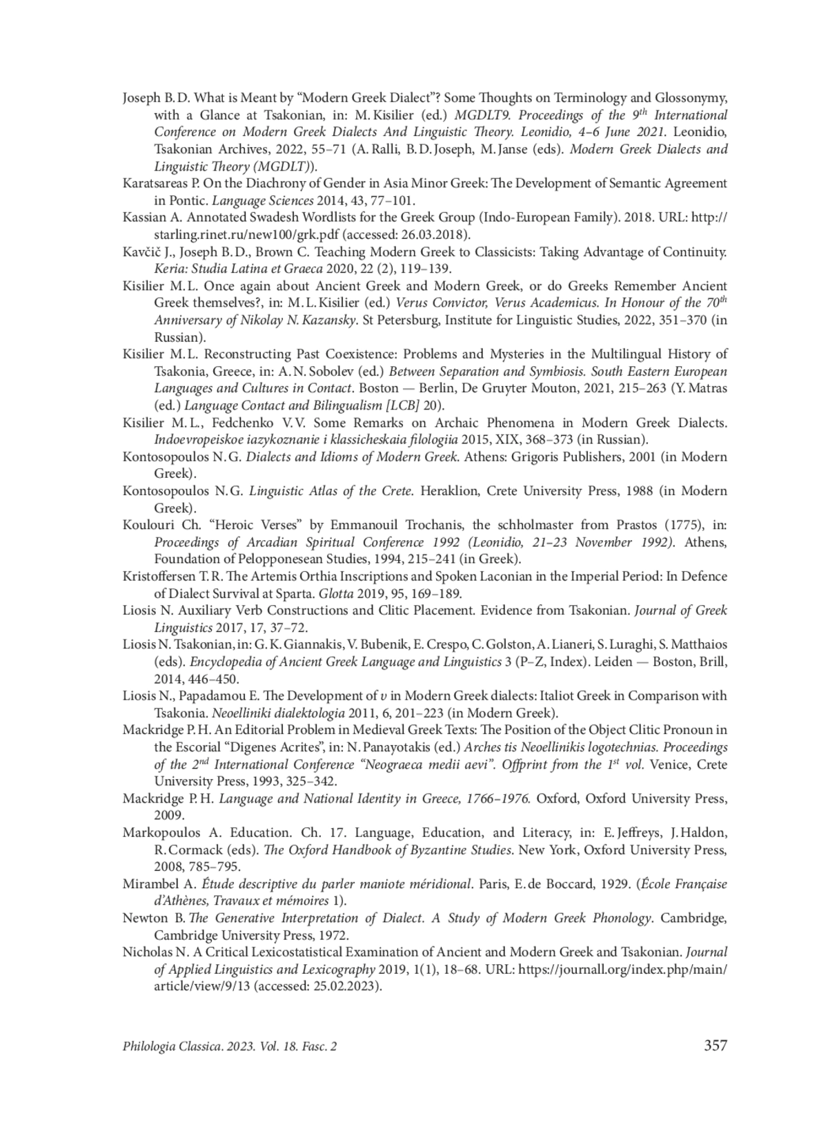 22. Joseph B. D. What is Meant by “Modern Greek Dialect”? Some Thoughts on Terminology and Glossonymy, with a Glance at Tsakonian, in: M. Kisilier (ed.) MGDLT9. Proceedings of the 9th International Conference on Modern Greek Dialects And Linguistic Theory. Leonidio, 4-6 June 2021. Leonidio, Tsakonian Archives, 2022, 55-71 (A. Ralli, B. D. Joseph, M. Janse (eds). Modern Greek Dialects and Linguistic Theory (MGDLT)).