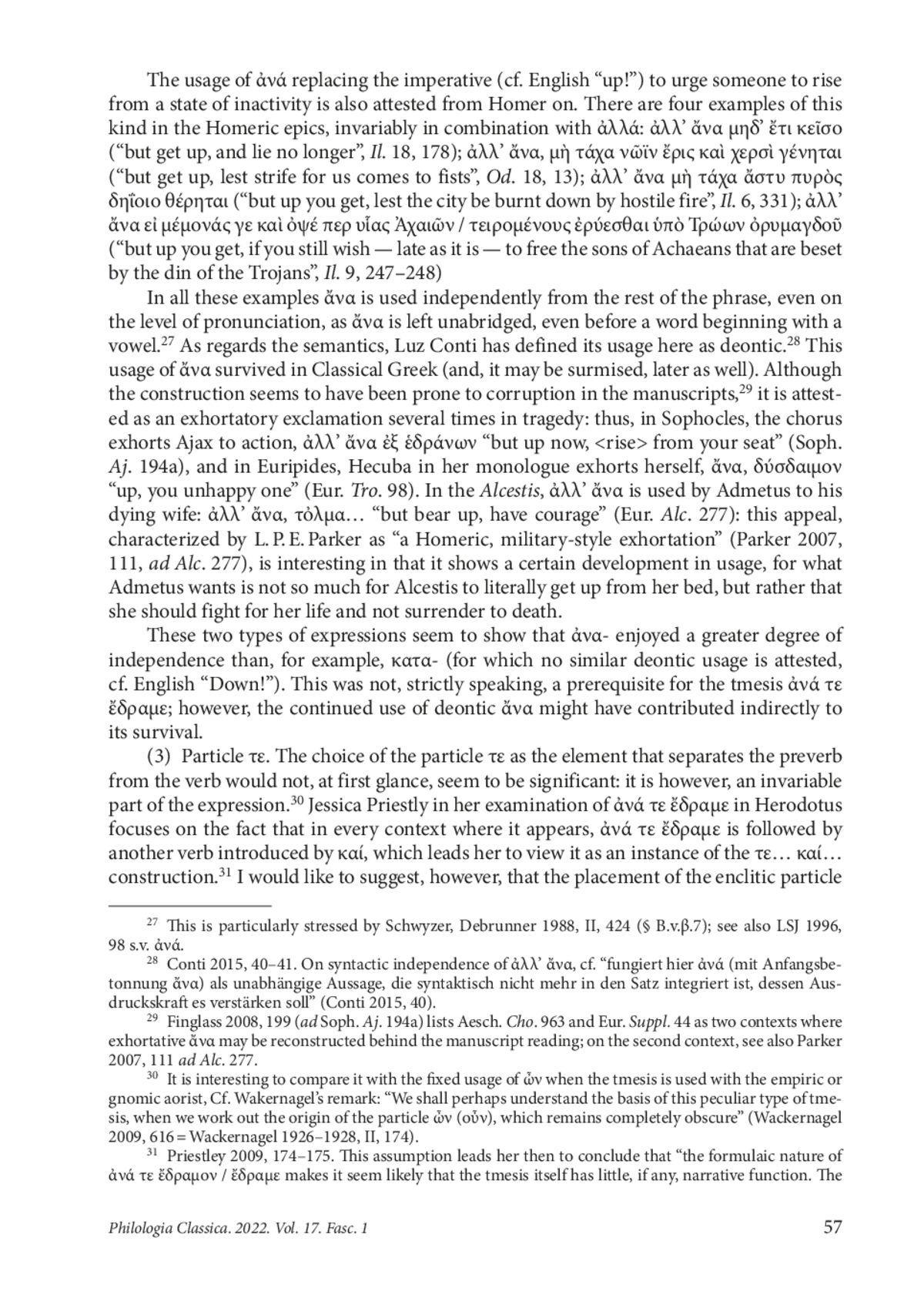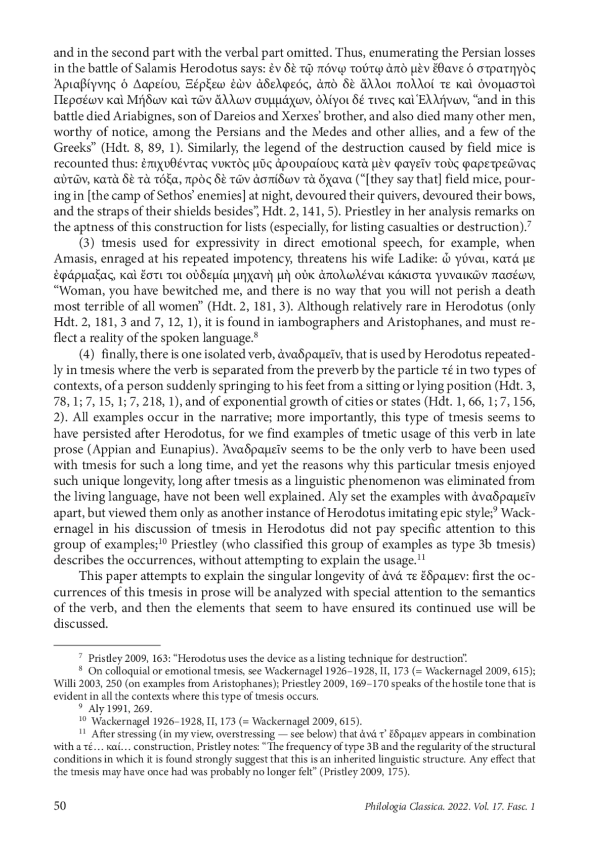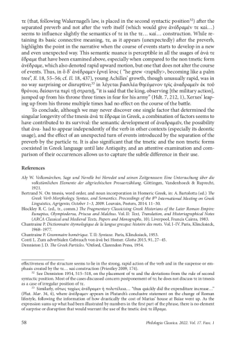 It is a well-known fact that tmesis (independent use of the preverb from its verb) as a linguistic phenomenon was progressively eliminated from Ancient Greek, so that only residual usage is attested in the language of the Classical age. However, one verb, ἀναδραμεῖν, retained tmetic usage with the particle τε intervening between the preverb and the verb, ἀνά τε ἔδραμε, until late Antiquity (Appian, Eunapius). It is significant that this construction (on par with the non tmetic form ἀνέδραμε) was used in prose, which suggests that it was part of actual linguistic usus. The article examines the reasons behind the unique longevity of this tmesis. Following an overview of the occurrences of ἀνά τε ἔδραμεν in Herodotus, Appian and Eunapius, and the comparison of the use of the tmetic and non tmetic forms, the elements of the construction are discussed. It is shown that the survival of ἀνά τε ἔδραμεν must have been influenced by the semantic development of the verb (the root no longer denotes actual running, but springing to one’s feet or rapid growth), as well as the capacity of the preverb ἀνα- to appear independently of its verb (the deontic ἄνα). Finally, a possible shift in meaning of τε (as invariable part of the expression) is discussed. While it is impossible to pinpoint one single factor that determined the singular longevity of the tmesis ἀνά τε ἔδραμε in Greek, a combination of factors seems to have contributed to its survival