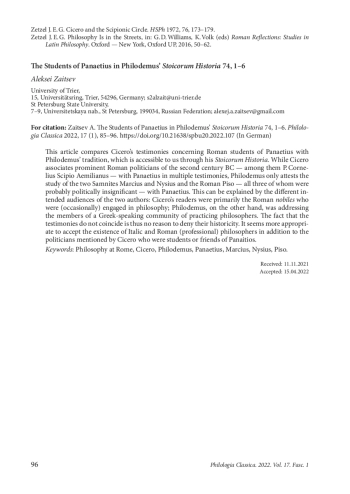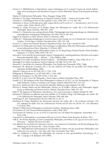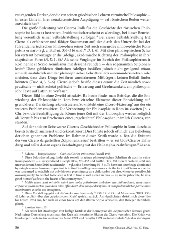 Im folgenden Beitrag sollen Ciceros Nachrichten zu den römischen Schülern des griechischen Philosophen Panaitios (2. Jh. v. Chr.) mit Philodems Tradition, die uns durch seine Stoicorum Historia zugänglich ist, verglichen werden. Während Cicero in mehreren Zeugnissen prominente römische Politiker des zweiten Jhs. v. Chr. — unter anderem P. Cornelius Scipio Aemilianus — mit Panaitios in Verbindung bringt, bezeugt Philodem lediglich das Studium der beiden Samniten Marcius sowie Nysius und des Römers Piso — alle drei waren politisch wohl unbedeutend — bei Panaitios. Dies lässt sich durch die unterschiedlichen Zielgruppen der beiden Autoren erklären: Ciceros Leser waren in erster Linie die römischen nobiles, die sich (gelegentlich) mit der Philosophie beschäftigten, Philodem wiederum wendete sich an die Angehörigen eines Griechisch lesenden Fachpublikums. Die Tatsache, dass sich die, Listen‘ der Schüler bei den beiden Autoren nicht decken, ist somit kein Grund, ihre Historizität abzustreiten. Angemessener scheint es, neben den von Cicero genannten Politikern, die mit Panaitios befreundet waren, die Existenz italischer und römischer (Berufs-)Philosophen zu akzeptieren.
