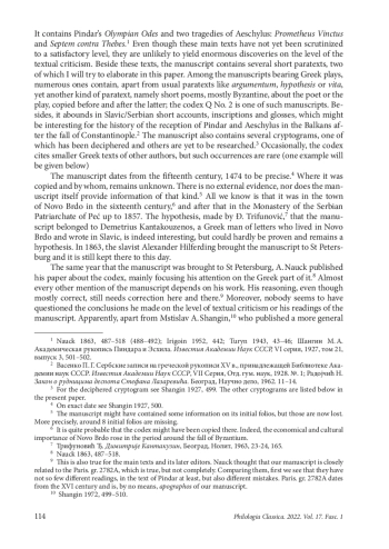 From the philological point of view, the manuscript Q No. 2 of the Library of the Russian Academy of Sciences in St Petersburg is more than interesting on many levels. It contains Pindar’s Olympian Odes and two tragedies of Aeschylus: Prometheus Vinctus and Septem contra Thebes.1 Even though these main texts have not yet been scrutinized to a satisfactory level, they are unlikely to yield enormous discoveries on the level of the textual criticism. Beside these texts, the manuscript contains several short paratexts, two of which I will try to elaborate in this paper. Among the manuscripts bearing Greek plays, numerous ones contain, apart from usual paratexts like argumentum, hypothesis or vita, yet another kind of paratext, namely short poems, mostly Byzantine, about the poet or the play, copied before and after the latter; the codex Q No. 2 is one of such manuscripts. Besides, it abounds in Slavic/Serbian short accounts, inscriptions and glosses, which might be interesting for the history of the reception of Pindar and Aeschylus in the Balkans after the fall of Constantinople.2 The manuscript also contains several cryptograms, one of which has been deciphered and others are yet to be researched.3 Occasionally, the codex cites smaller Greek texts of other authors, but such occurrences are rare (one example will be given below)
