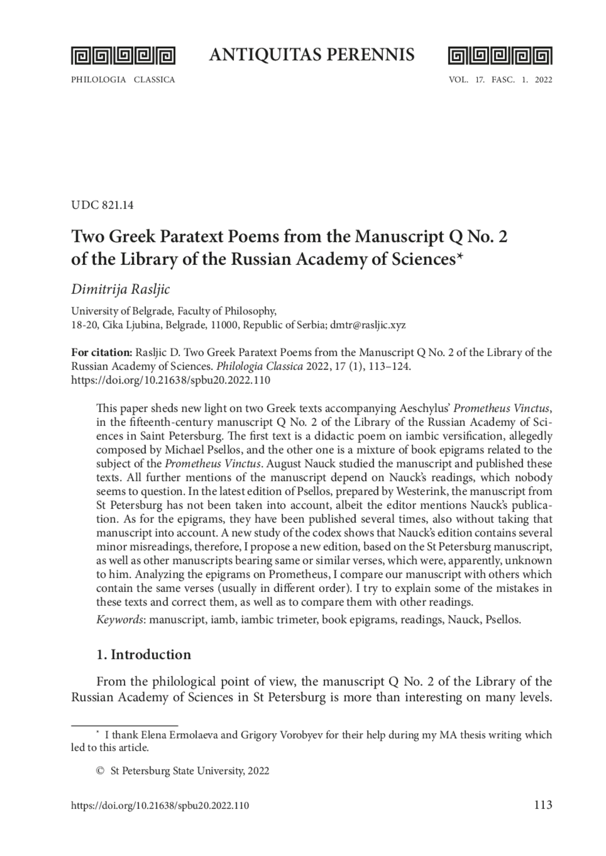 This paper sheds new light on two Greek texts accompanying Aeschylus’ Prometheus Vinctus, in the fifteenth-century manuscript Q No. 2 of the Library of the Russian Academy of Sciences in Saint Petersburg. The first text is a didactic poem on iambic versification, allegedly composed by Michael Psellos, and the other one is a mixture of book epigrams related to the subject of the Prometheus Vinctus. August Nauck studied the manuscript and published these texts. All further mentions of the manuscript depend on Nauck’s readings, which nobody seems to question. In the latest edition of Psellos, prepared by Westerink, the manuscript from St Petersburg has not been taken into account, albeit the editor mentions Nauck’s publication. As for the epigrams, they have been published several times, also without taking that manuscript into account. A new study of the codex shows that Nauck’s edition contains several minor misreadings, therefore, I propose a new edition, based on the St Petersburg manuscript, as well as other manuscripts bearing same or similar verses, which were, apparently, unknown to him. Analyzing the epigrams on Prometheus, I compare our manuscript with others which contain the same verses (usually in different order). I try to explain some of the mistakes in these texts and correct them, as well as to compare them with other readings.
