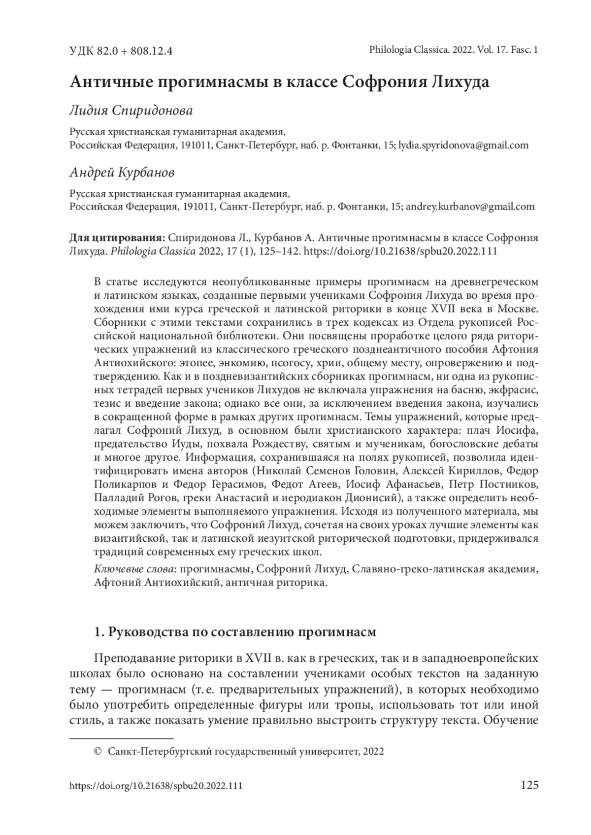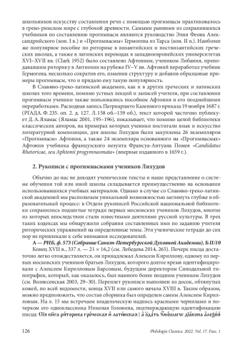 В статье исследуются неопубликованные примеры прогимнасм на древнегреческом и латинском языках, созданные первыми учениками Софрония Лихуда во время прохождения ими курса греческой и латинской риторики в конце XVII века в Москве. Сборники с этими текстами сохранились в трех кодексах из Отдела рукописей Российской национальной библиотеки. Они посвящены проработке целого ряда риторических упражнений из классического греческого позднеантичного пособия Афтония Антиохийского: этопее, энкомию, псогосу, хрии, общему месту, опровержению и подтверждению. Как и в поздневизантийских сборниках прогимнасм, ни одна из рукописных тетрадей первых учеников Лихудов не включала упражнения на басню, экфрасис, тезис и введение закона; однако все они, за исключением введения закона, изучались в сокращенной форме в рамках других прогимнасм. Темы упражнений, которые предлагал Софроний Лихуд, в основном были христианского характера: плач Иосифа, предательство Иуды, похвала Рождеству, святым и мученикам, богословские дебаты и многое другое. Информация, сохранившаяся на полях рукописей, позволила идентифицировать имена авторов (Николай Семенов Головин, Алексей Кириллов, Федор Поликарпов и Федор Герасимов, Федот Агеев, Иосиф Афанасьев, Петр Постников, Палладий Рогов, греки Анастасий и иеродиакон Дионисий), а также определить необходимые элементы выполняемого упражнения. Исходя из полученного материала, мы можем заключить, что Софроний Лихуд, сочетая на своих уроках лучшие элементы как византийской, так и латинской иезуитской риторической подготовки, придерживался традиций современных ему греческих школ