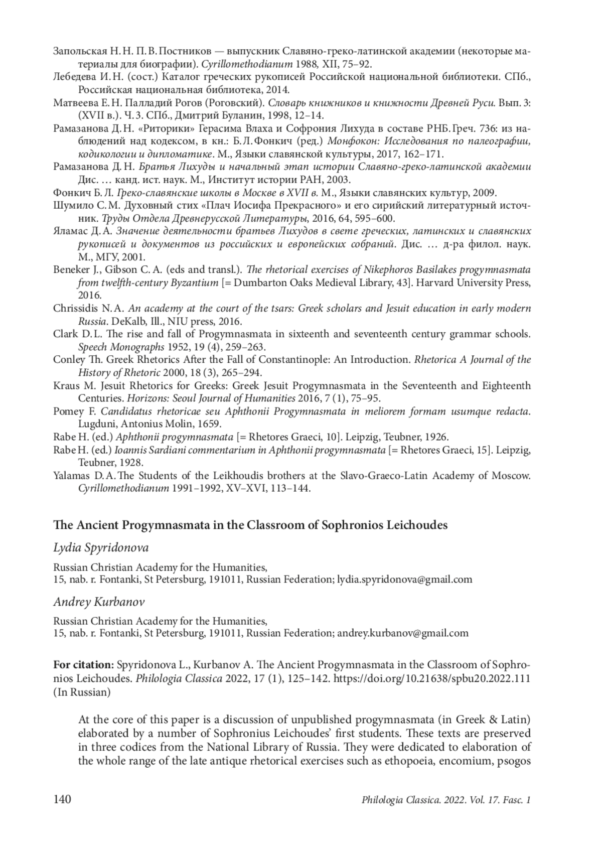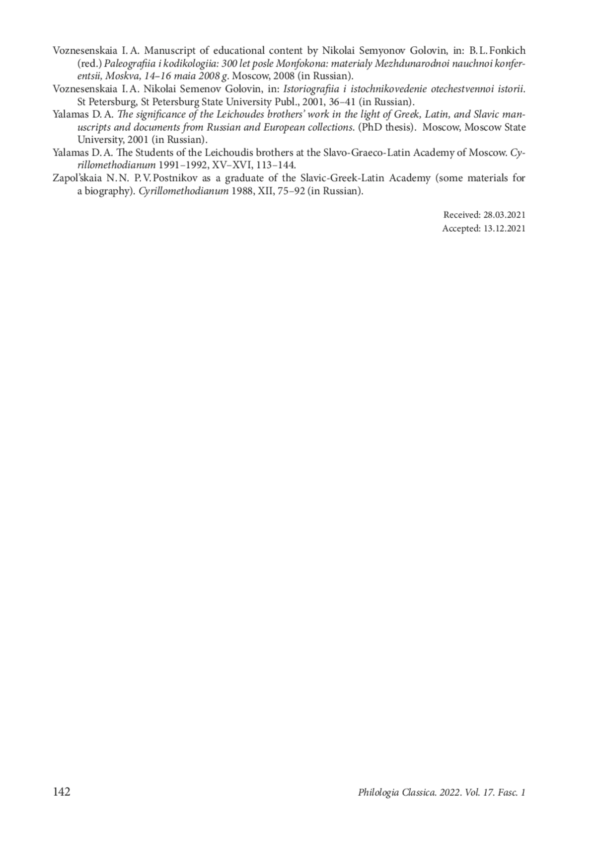 22. Yalamas D. A. The Students of the Leikhoudis brothers at the Slavo-Graeco-Latin Academy of Moscow. Cyrillomethodianum 1991-1992, XV-XVI, 113-144.