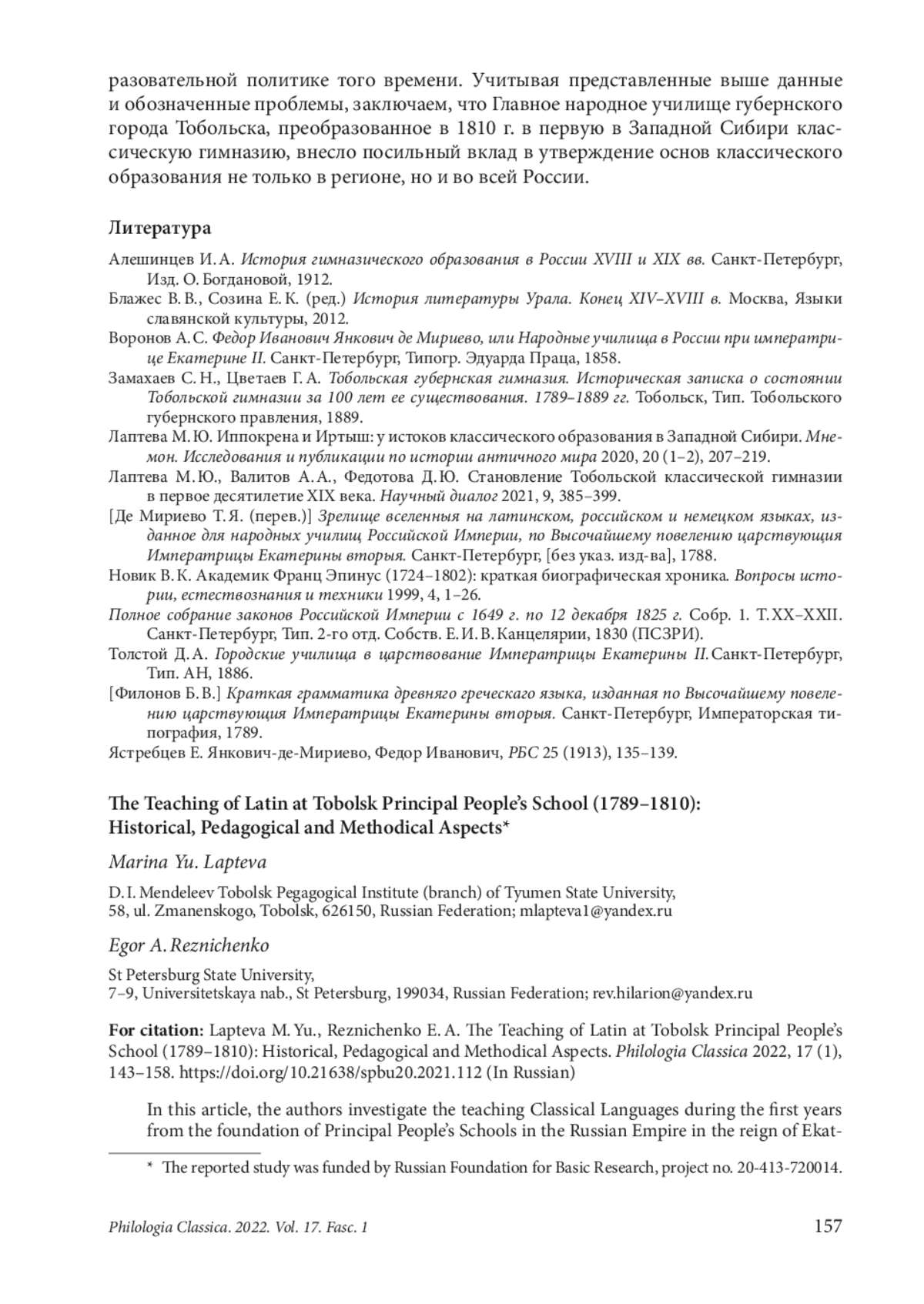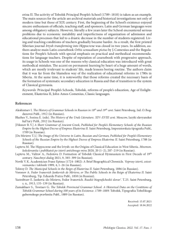 6. Лаптева М. Ю., Валитов А. А., Федотова Д. Ю. Становление Тобольской классической гимназии в первое десятилетие XIX века. Научный диалог 2021, 9, 385-399. EDN: DBPOQH