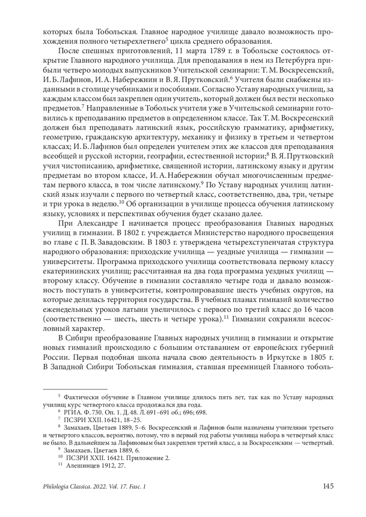 В статье рассматривается история преподавания классических языков в первые годы с момента образования Главных народных училищ в Российской империи в правление Екатерины II. В качестве примера берется Тобольское Главное народное училище в период с 1789 по 1810 г., в которое были направлены выпускники Учительской семинарии Санкт-Петербурга. Дана характеристика реформы среднего образования при Екатерине II, краткая информация о реформах классического образования в XIX в. и их вопло - щении в Западной Сибири. Также анализируются учебники, переведенные с австрийских и заново написанные для Главных народных училищ. Подробно рассматривается Устав народных училищ в части практических и методических рекомендаций учителю иностранных языков (латинский и немецкий). Приводится анализ методических принципов учебника по латинскому языку Я. А. Коменского, адаптированного для преподавания латыни в Главных народных училищах. Рассматриваются основные тематические блоки и методические особенности подачи материала, приводятся примеры текстов учебника. Публикация ставит перед собой цель рассмотреть истоки развития российского классического образования как общественного института с точки зрения практического воплощения и методического анализа, а также произвести обзор организационных составляющих преподавания в Тобольском Главном народном училище. Исследуются конкретно-исторические условия работы учителей, особенности преподавания древних языков в сибирской столице. Материал свидетельствует о далеко не безупречном характере воплощения образовательных реформ 1780-х гг. в условиях Сибири. В то же время нельзя не признать, что реформы заложили необходимую основу для формирования систематического среднего образования в России и переходу к системе классических гимназий, имеющих связь и преемство с университетами европейской части России, что положительно сказалось на культурном и экономическом развитии Западной Сибири в XIX — начале XX в