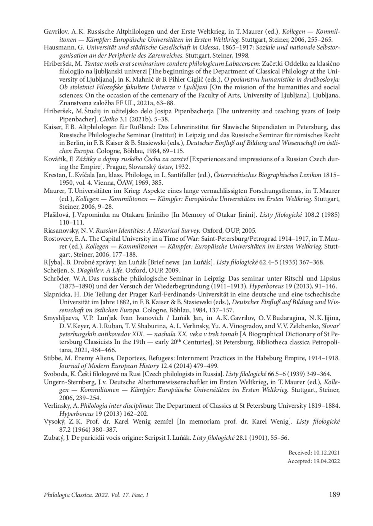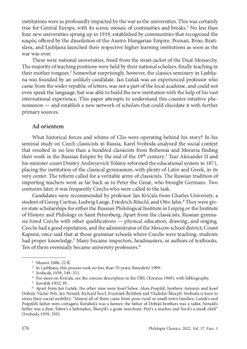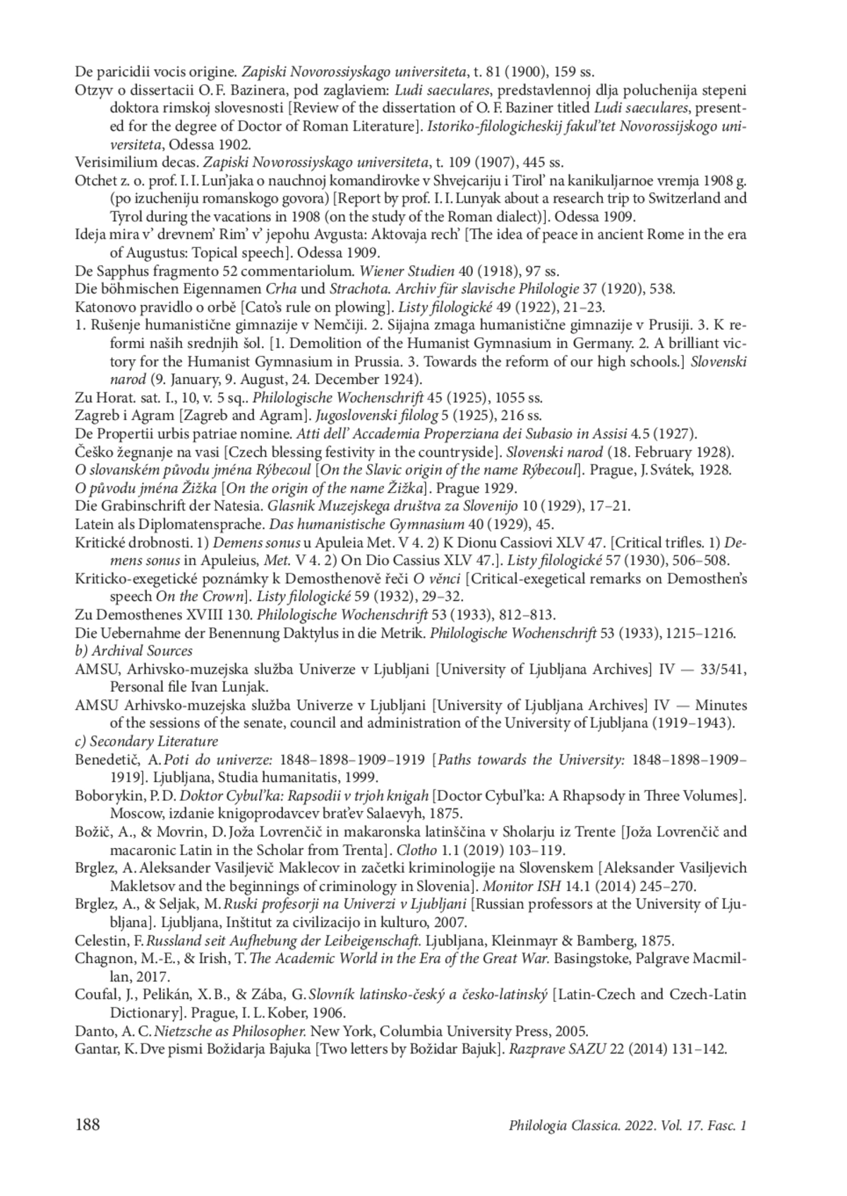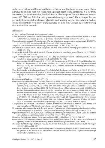 The present paper is the first attempt at a bio-bibliography of Jan Luňák (1847–1935), the peripatetic classicist who roamed the Austro-Hungarian, German, and Russian empires before founding the classical seminar at the University of Ljubljana, in 1919, in what was then the Kingdom of Serbs, Croats, and Slovenians. Luňák studied in Prague and Leipzig and then moved to St Petersburg to earn his master’s in classical philology from Dorpat (now Tartu) and his doctorate in Greek literature from Kazan. In 1890 he became extraordinarius in Moscow, and in 1892 ordinarius in Odessa, from where he retired in 1907. Known primarily for his Quaestiones Sapphicae, he was forced to launch a second career in 1919, after World War I and then the October Revolution permanently separated him from his family and deprived him of his pension. He served as contractual professor of classical philology in Ljubljana until 1930 when he finally returned to Prague. Based on both published and archival material, the paper provides a historical context for his academic career (which had its roots in the Russian Philological Seminary in Leipzig, where Luňák was recommended by Friedrich Ritschl). It thus attempts to understand the somewhat disparate aspects of his complex scholarly itinerary. Apart from providing his comprehensive bibliography, the study hopes to serve as a stimulus for other primary sources to surface in the future
