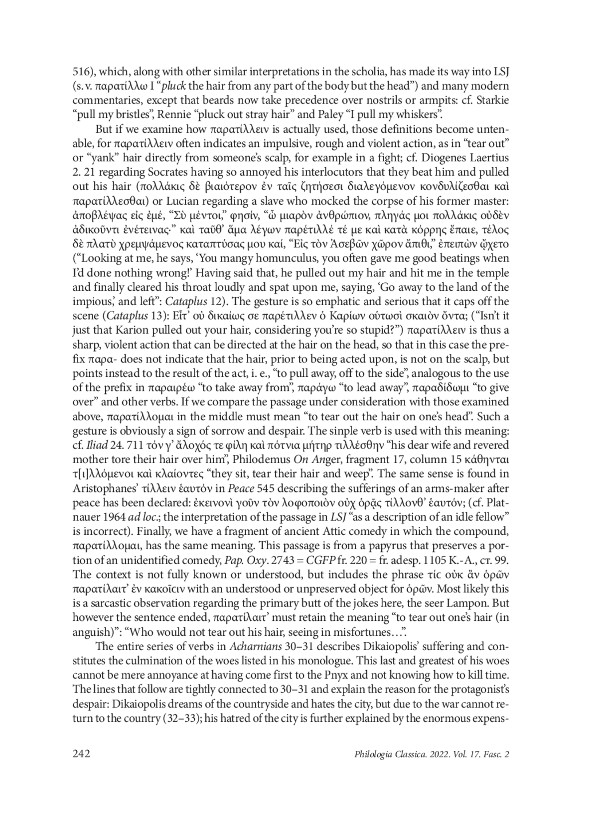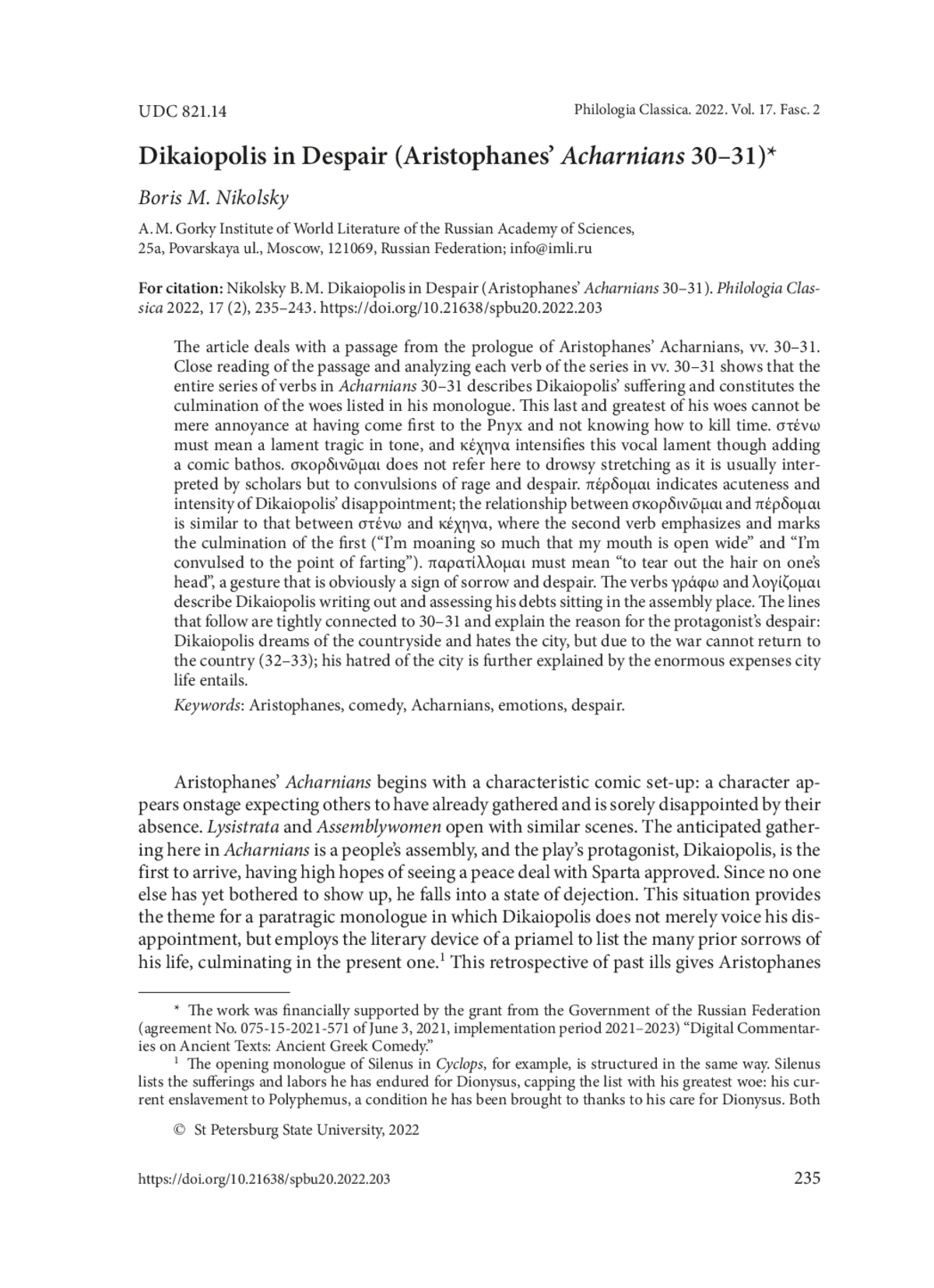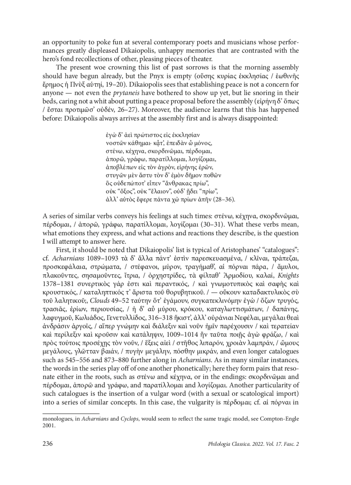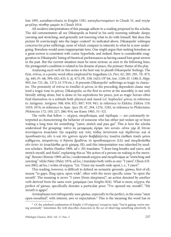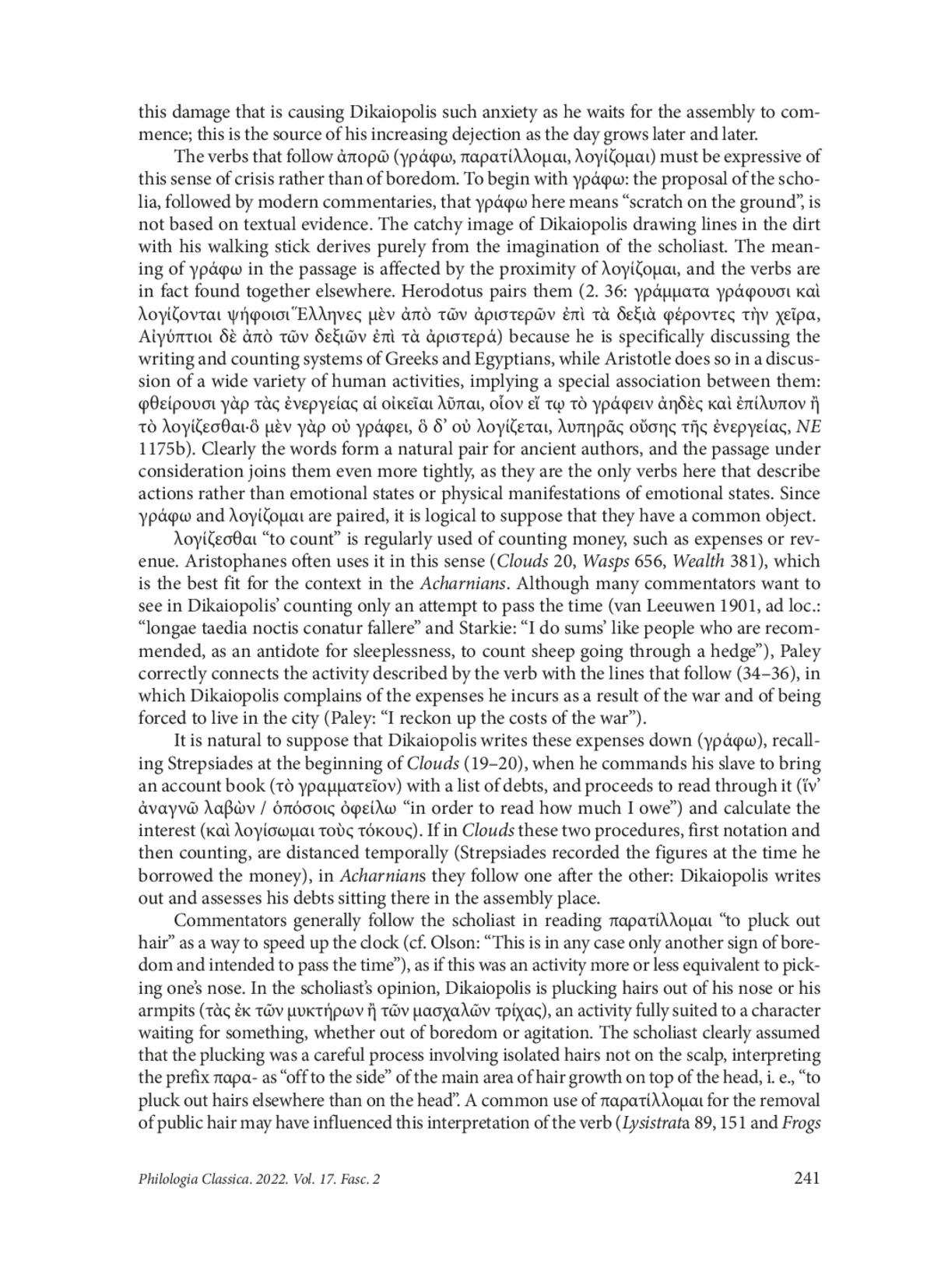 The article deals with a passage from the prologue of Aristophanes’ Acharnians, vv. 30–31. Close reading of the passage and analyzing each verb of the series in vv. 30–31 shows that the entire series of verbs in Acharnians 30–31 describes Dikaiopolis’ suffering and constitutes the culmination of the woes listed in his monologue. This last and greatest of his woes cannot be mere annoyance at having come first to the Pnyx and not knowing how to kill time. στένω must mean a lament tragic in tone, and κέχηνα intensifies this vocal lament though adding a comic bathos. σκορδινῶμαι does not refer here to drowsy stretching as it is usually interpreted by scholars but to convulsions of rage and despair. πέρδομαι indicates acuteness and intensity of Dikaiopolis’ disappointment; the relationship between σκορδινῶμαι and πέρδομαι is similar to that between στένω and κέχηνα, where the second verb emphasizes and marks the culmination of the first (“I’m moaning so much that my mouth is open wide” and “I’m convulsed to the point of farting”). παρατίλλομαι must mean “to tear out the hair on one’s head”, a gesture that is obviously a sign of sorrow and despair. The verbs γράφω and λογίζομαι describe Dikaiopolis writing out and assessing his debts sitting in the assembly place. The lines that follow are tightly connected to 30–31 and explain the reason for the protagonist’s despair: Dikaiopolis dreams of the countryside and hates the city, but due to the war cannot return to the country (32–33); his hatred of the city is further explained by the enormous expenses city life entails.
