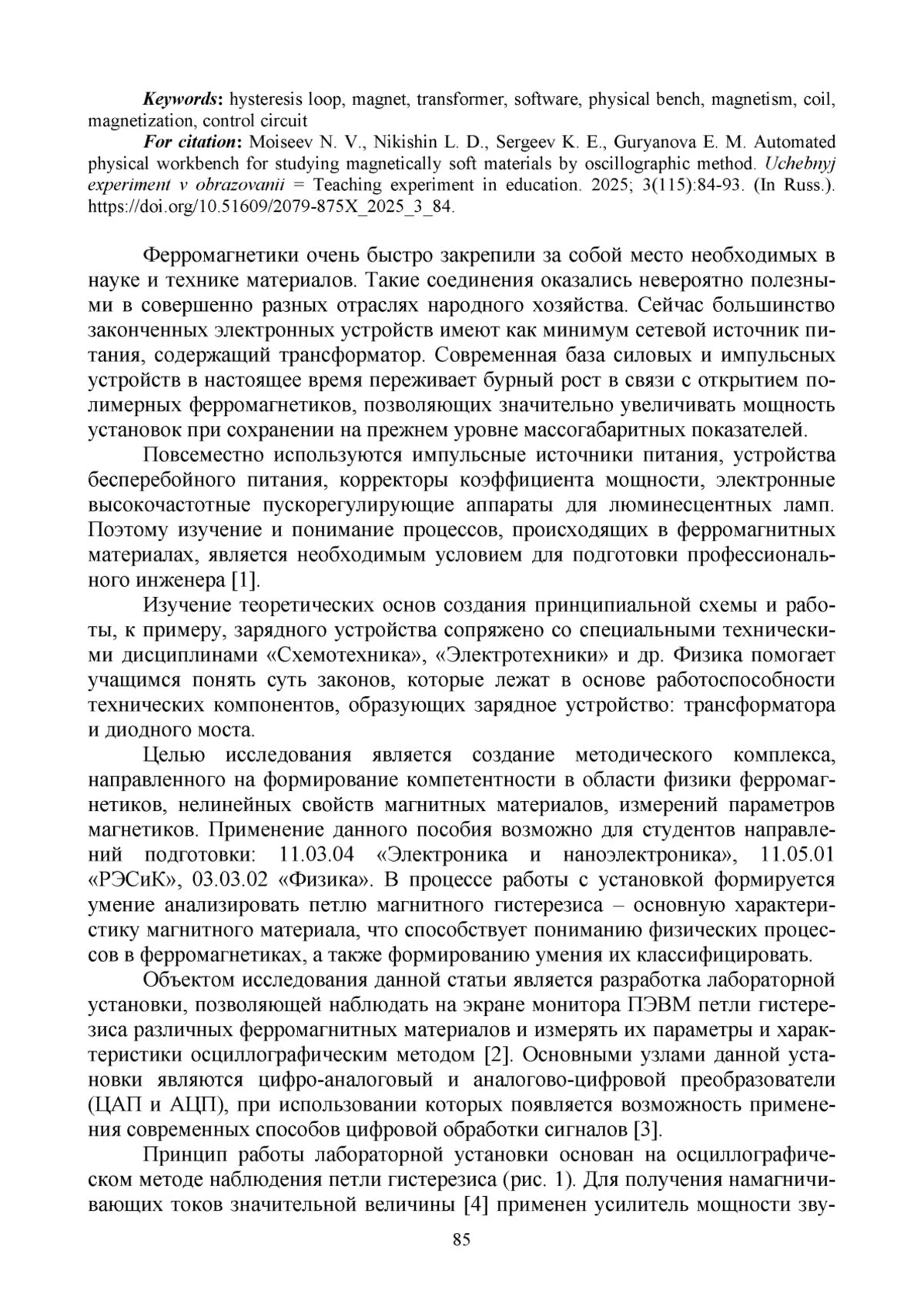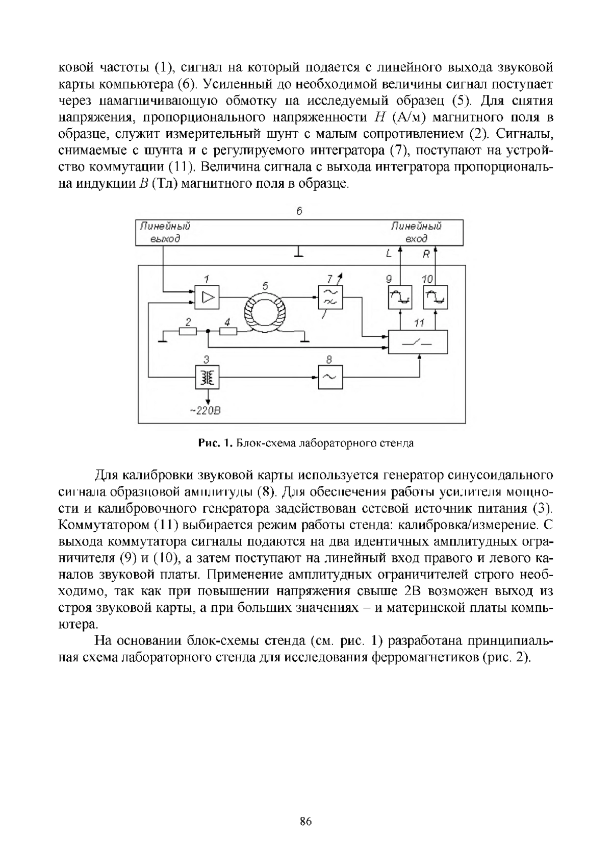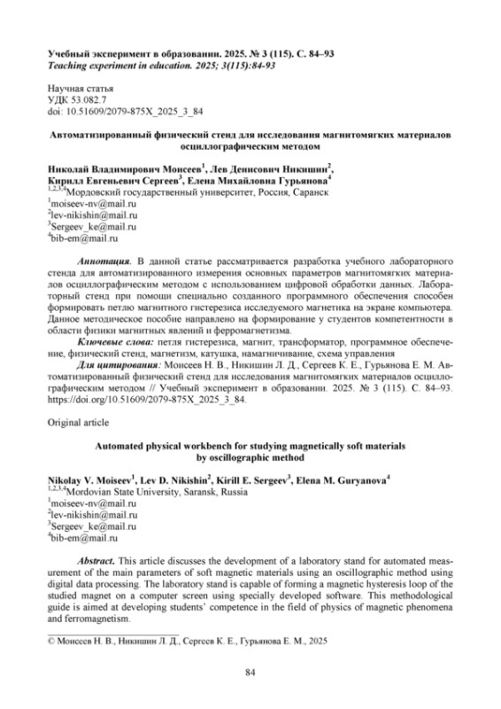 В данной статье рассматривается разработка учебного лабораторного стенда для автоматизированного измерения основных параметров магнитомягких материалов осциллографическим методом с использованием цифровой обработки данных. Лабораторный стенд при помощи специально созданного программного обеспечения способен формировать петлю магнитного гистерезиса исследуемого магнетика на экране компьютера. Данное методическое пособие направлено на формирование у студентов компетентности в области физики магнитных явлений и ферромагнетизма.