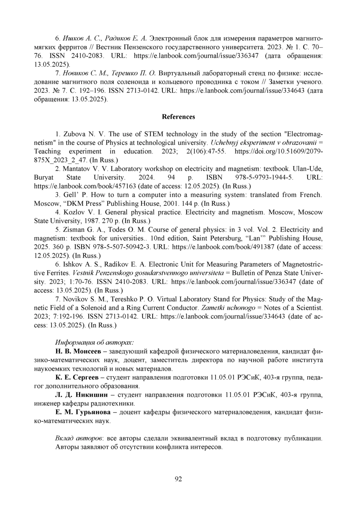 6. Ишков А. С., Радиков Е. А. Электронный блок для измерения параметров магнитомягких ферритов // Вестник Пензенского государственного университета. 2023. № 1. С. 7076. ISSN 2410-2083. URL: https://e.lanbook.com/journal/issue/336347 (дата обращения: 13.05.2025). EDN: LJZNGD