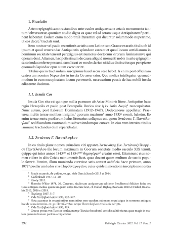 Artem epigraphicam tractantibus ante oculos antiquae sane aetatis monumenta tantum1 obversantur, quoniam studio digna ea quae vel ad seram usque Antiquitatem 2 pertinent habentur. Eodem enim modo tituli Byzantini qui dicuntur solummodo nuperrime, ut eos decet,3 tractati sunt. Item nostrae vel paulo recentioris aetatis cum Latine tum Graece exaratis titulis ob id ipsum et quod venerandae Antiquitatis splendore careant et quod locum cottidianum in hominum societate teneant perexiguus est numerus doctorum virorum feminarumve qui operam dent. Attamen, hac potissimum de causa aliquid momenti nobis in arte epigraphica colenda conferre possunt, cum liceat eo modo clarius nitidius distinctiusque perspicere quomodo lapicidae opus suum exercuerint.