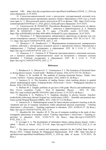 6. Антонова Д. А. Методическая система продуктивного обучения будущих учителей разработке и применению компьютерных симуляций учебного физического эксперимента // Учебный эксперимент в образовании. 2023. № 4 (108). С. 43-57. Х_2023_4_43. DOI: 10.51609/2079-875 EDN: BETLSE