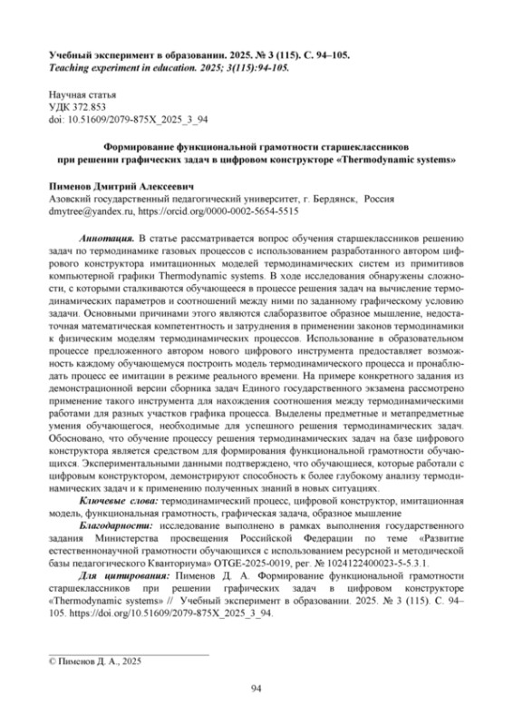 В ходе исследования обнаружены сложности, с которыми сталкиваются обучающееся в процессе решения задач на вычисление термодинамических параметров и соотношений между ними по заданному графическому условию задачи. Основными причинами этого являются слаборазвитое образное мышление, недостаточная математическая компетентность и затруднения в применении законов термодинамики к физическим моделям термодинамических процессов. Использование в образовательном процессе предложенного автором нового цифрового инструмента предоставляет возможность каждому обучающемуся построить модель термодинамического процесса и пронаблюдать процесс ее имитации в режиме реального времени. На примере конкретного задания из демонстрационной версии сборника задач Единого государственного экзамена рассмотрено применение такого инструмента для нахождения соотношения между термодинамическими работами для разных участков графика процесса. Выделены предметные и метапредметные умения обучающегося, необходимые для успешного решения термодинамических задач. Обосновано, что обучение процессу решения термодинамических задач на базе цифрового конструктора является средством для формирования функциональной грамотности обучающихся. Экспериментальными данными подтверждено, что обучающиеся, которые работали с цифровым конструктором, демонстрируют способность к более глубокому анализу термодинамических задач и к применению полученных знаний в новых ситуациях.