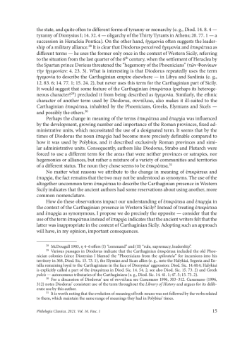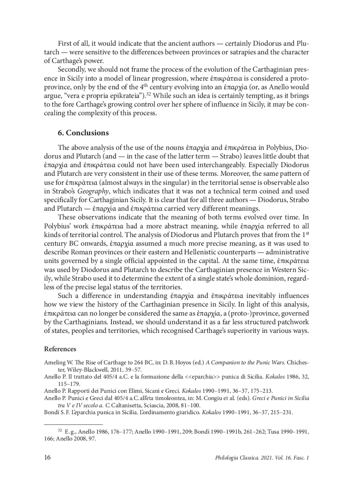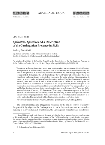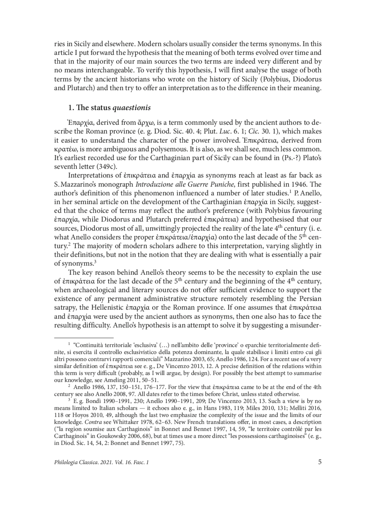 The terms ἐπικράτεια and ἐπαρχία are both used by the ancient sources to describe the part of Sicily subject to the Carthaginians. As such, they are important to our understanding of Sicily’s status and, by extension, the Carthaginian policy towards such territories in Sicily and elsewhere. Modern scholars usually consider the terms synonyms. In this article I put forward the hypothesis that the meaning of both terms evolved over time and that in the majority of our main sources the two terms are indeed very different and by no means interchangeable. To verify this hypothesis, I will first analyse the usage of both terms by the ancient historians who wrote on the history of Sicily (Polybius, Diodorus and Plutarch) and then try to offer an interpretation as to the difference in their meaning