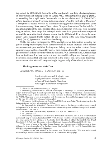 There has been much controversy regarding the date, the performative context, and the generic quality of fragment 926 PMG, which has been preserved on papyrus (P. Oxy. 9 + P. Oxy 2687) in a rhythmical treatise by an unknown author. The verse fragments on this papyrus were composed in iambic dactyls (∪ — ∪ –) and used as examples of the occurrence of syncope in various lyric meters. Fragments 926(a) and (g) PMG are from a composition performed by a maiden chorus which bear similarities to Alcman’s partheneia and have affinities with archaic epic and lyric poetry. Supposedly, these fragments might have been fragments of partheneia composed in the time of the New Music. Nonetheless, they are not shaped according to the bulk of the aesthetic values and the compositional rules of the New Music. These fragments seem to belong to cultic songs created for maiden choruses, possibly, to honor Dionysus. The alternative is that they imitate such songs within a dramatic context. We may assume that these quasi-dithyrambic partheneia were composed to serve religious needs or at least imitated cultic songs. They looked backward to the archaic and early classical tradition of partheneia, and their existence is an indication that, in the days of the New Music, there was a poetic tradition upheld by “reactionary” poets
