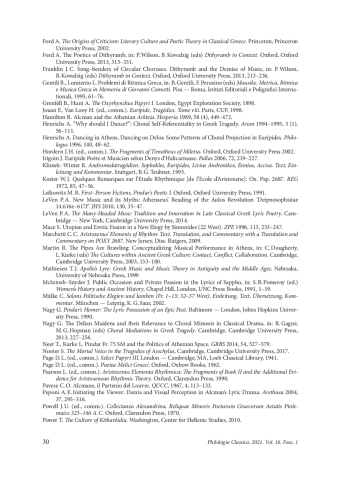 30. Franklin J. C. Song-benders of Circular Choruses. Dithyramb and the Demise of Music, in: P. Wilson, B. Kowalzig (eds) Dithyramb in Context. Oxford, Oxford University Press, 2013, 213-236.