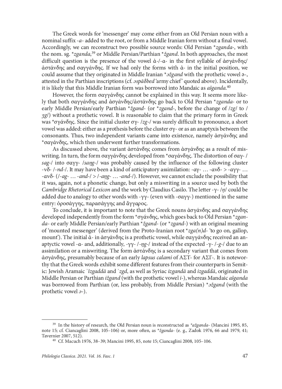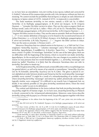 39. Mancini M. Etimologia e semantica del gr. ἄγγαρος. Glotta 1995-96, 73, 210-222.