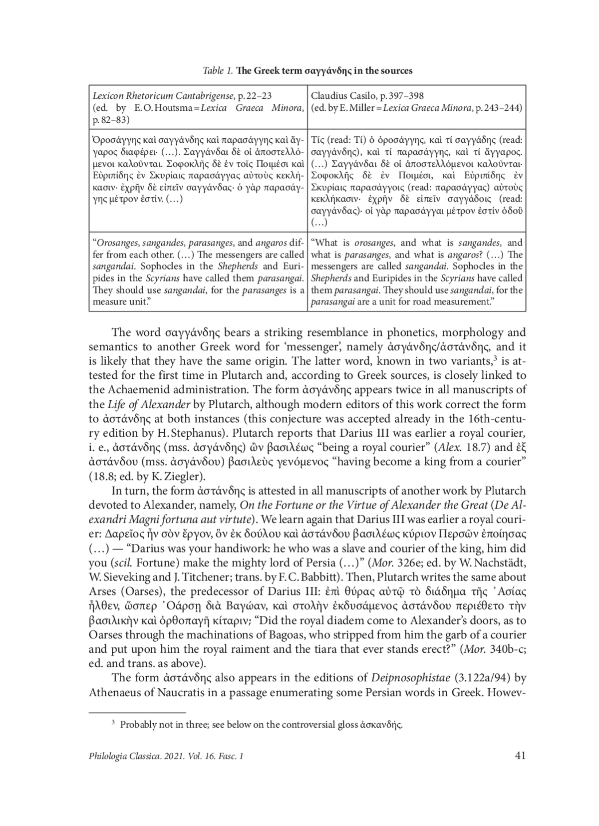 The noun σαγγάνδης ‘messenger, courier’,1 which has not been previously investigated is attested in two Greek lexica, dated to the Roman or early Byzantine periods: in the so-called Cambridge Rhetorical Lexicon (Lexicon Rhetoricum Cantabrigense) by an anonymous author, and in the Difficult Words in the Attic Orators (Τὰ παρὰ τοῖς Ἀττικοῖς ῥήτορσι ζητούμενα) by Claudius Casilo. The entries in both sources are almost identical (see Table 1)