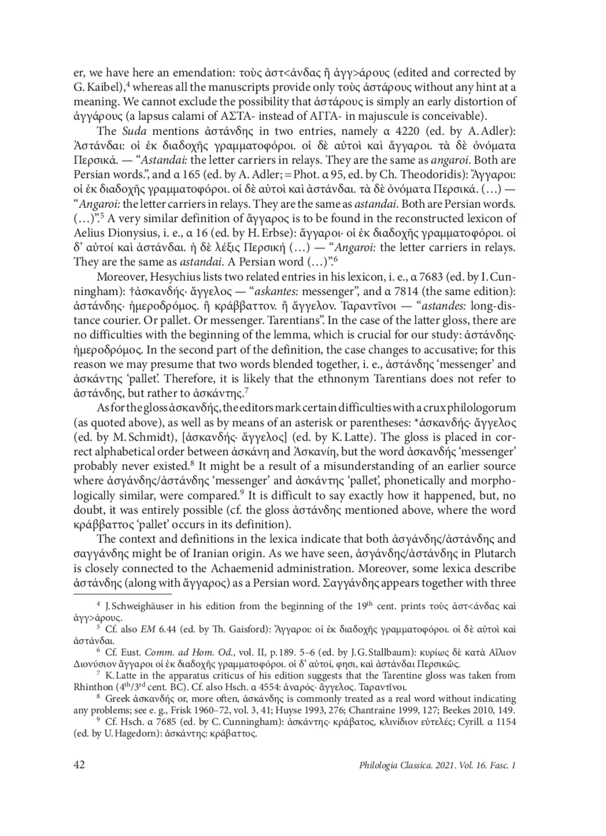 This article examines the Greek noun σαγγάνδης ‘messenger’ which is attested in two lexica, dated to the Roman or early Byzantine periods: the Cambridge Rhetorical Lexicon by an anonymous author and Difficult Words in the Attic Orators by Claudius Casilo. In both works, σαγγάνδης appears together with three words of likely Iranian provenance: ὀροσάγγης ‘benefactor of the Persian king; bodyguard’, παρασάγγης ‘parasang; messenger’ and ἄγγαρος ‘messenger, courier; workman, labourer’. The word σαγγάνδης is analysed in comparison with ἀσγάνδης/ἀστάνδης ‘messenger’ occurring for the first time in Plutarch’s works and closely linked to the Achaemenid administration. According to the hypothesis put forward in the present paper, both σαγγάνδης and ἀσγάνδης (with its secondary variant ἀστάνδης) are connected to Manichaean Middle Persian/Parthian ižgand ‘messenger’, Sogdian (a)žγand/(ɔ) žγand/ž(i)γant ‘id.’, Jewish Aramaic ʾîzgaddā ‘id.’, Syriac izgandā/izgaddā ‘id.’, Mandaic ašganda ‘helper, assistant, servant; the Messenger’, and go back to Old Persian *zganda- or to early Middle Persian/early Parthian *žgand- (or *zgand-) with the original meaning ‘mounted messenger’. The reconstructed noun is derived from the Proto-Iranian root *zga(n)d- ‘to go on, gallop, mount’, attested in Avestan (Younger Avestan zgaδ(/θ)- ‘to go on horseback, gallop’) and in some Middle and Modern Iranian languages. The original form of the loanword in Greek was probably *σγάνδης which then underwent certain transformations