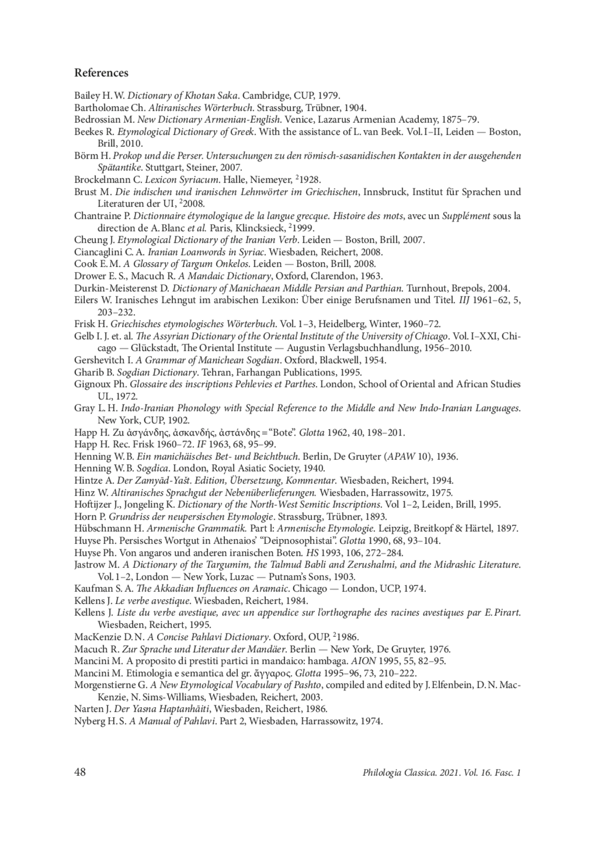 47. Schmitt R. Greece XII. Persian Loanwords and Names in Greek, in: Encyclopædia Iranica 2002a. Available at: http://www.iranicaonline.org/articles/greece-xii (accessed on 30 August 2020).