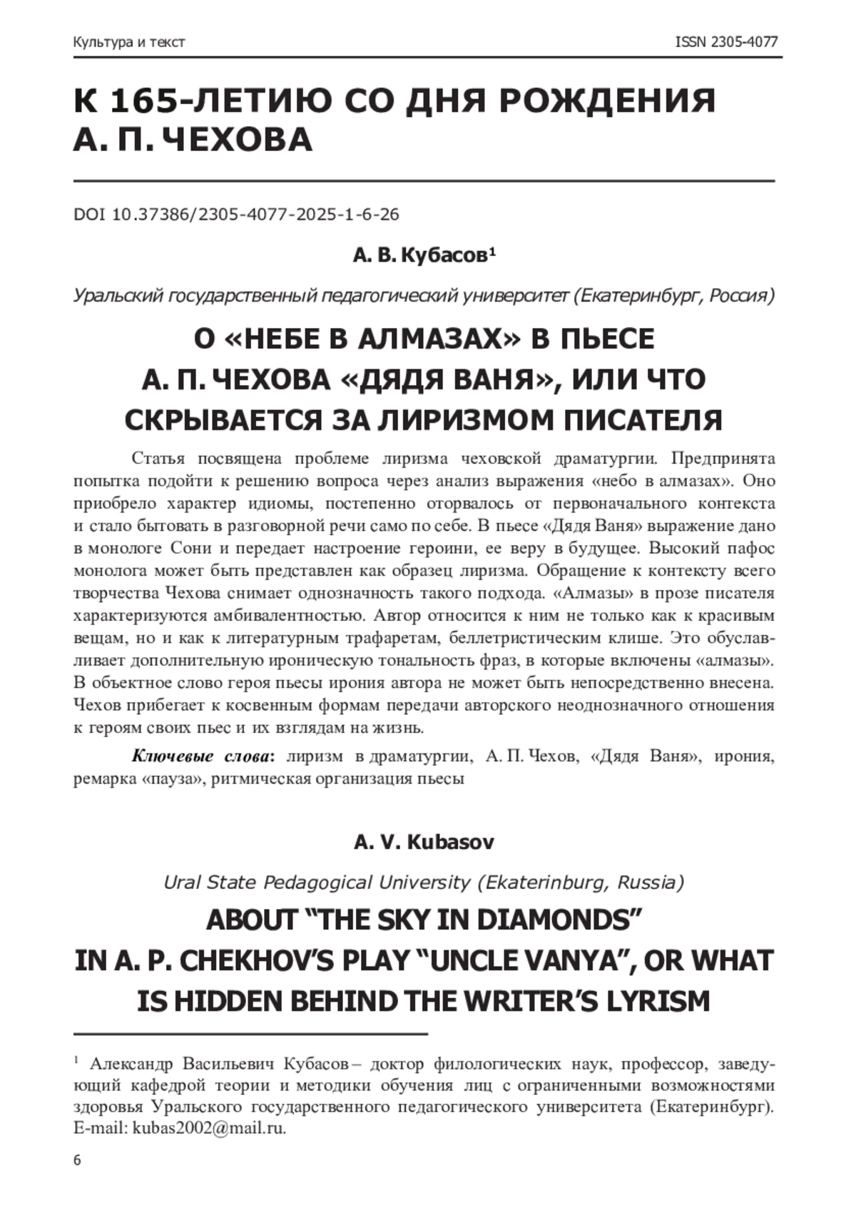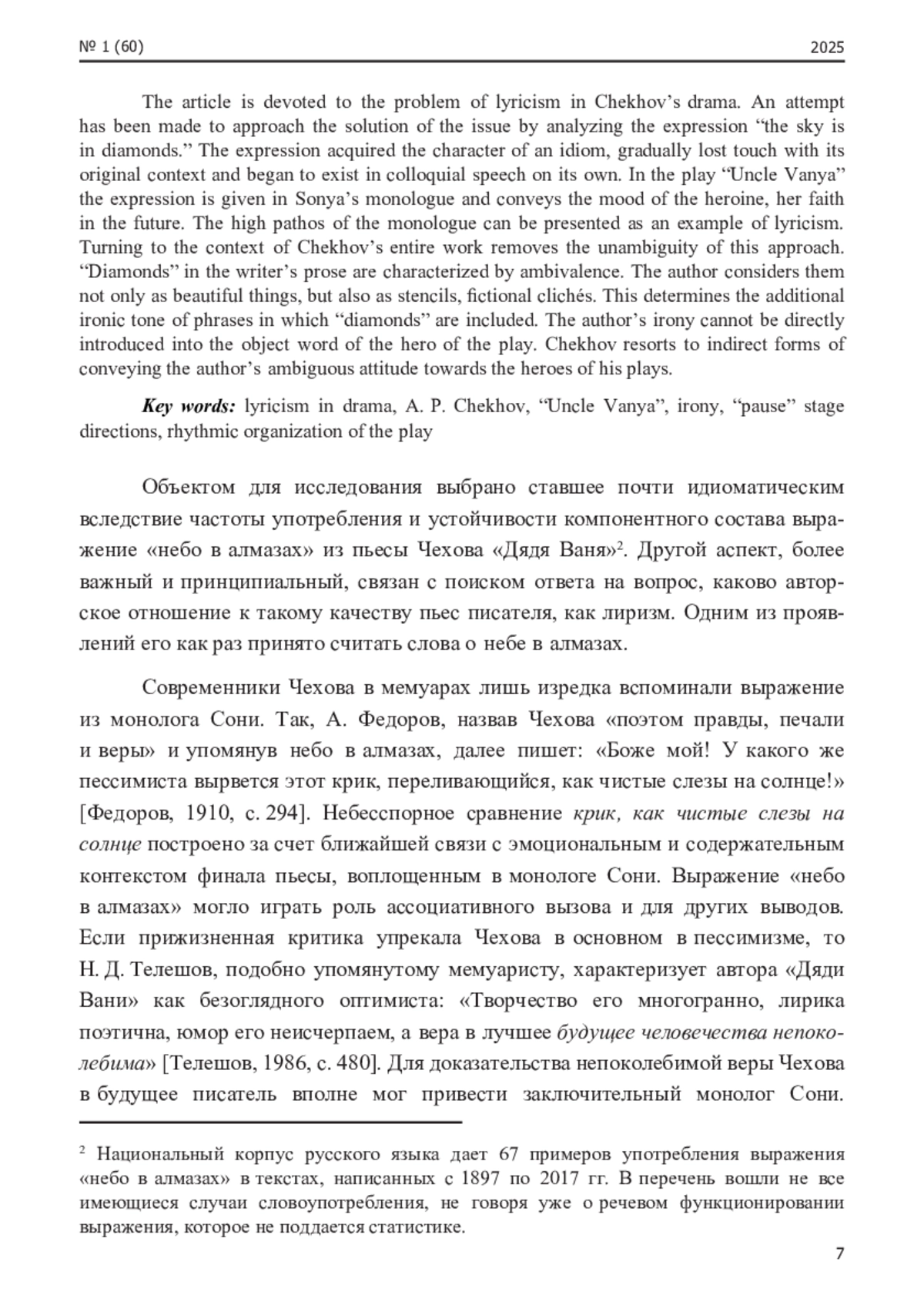Статья посвящена проблеме лиризма чеховской драматургии. Предпринята попытка подойти к решению вопроса через анализ выражения «небо в алмазах». Оно приобрело характер идиомы, постепенно оторвалось от первоначального контекста и стало бытовать в разговорной речи само по себе. В пьесе «Дядя Ваня» выражение дано в монологе Сони и передает настроение героини, ее веру в будущее. Высокий пафос монолога может быть представлен как образец лиризма. Обращение к контексту всего творчества Чехова снимает однозначность такого подхода. «Алмазы» в прозе писателя характеризуются амбивалентностью. Автор относится к ним не только как к красивым вещам, но и как к литературным трафаретам, беллетристическим клише. Это обуславливает дополнительную ироническую тональность фраз, в которые включены «алмазы». В объектное слово героя пьесы ирония автора не может быть непосредственно внесена. Чехов прибегает к косвенным формам передачи авторского неоднозначного отношения к героям своих пьес и их взглядам на жизнь.