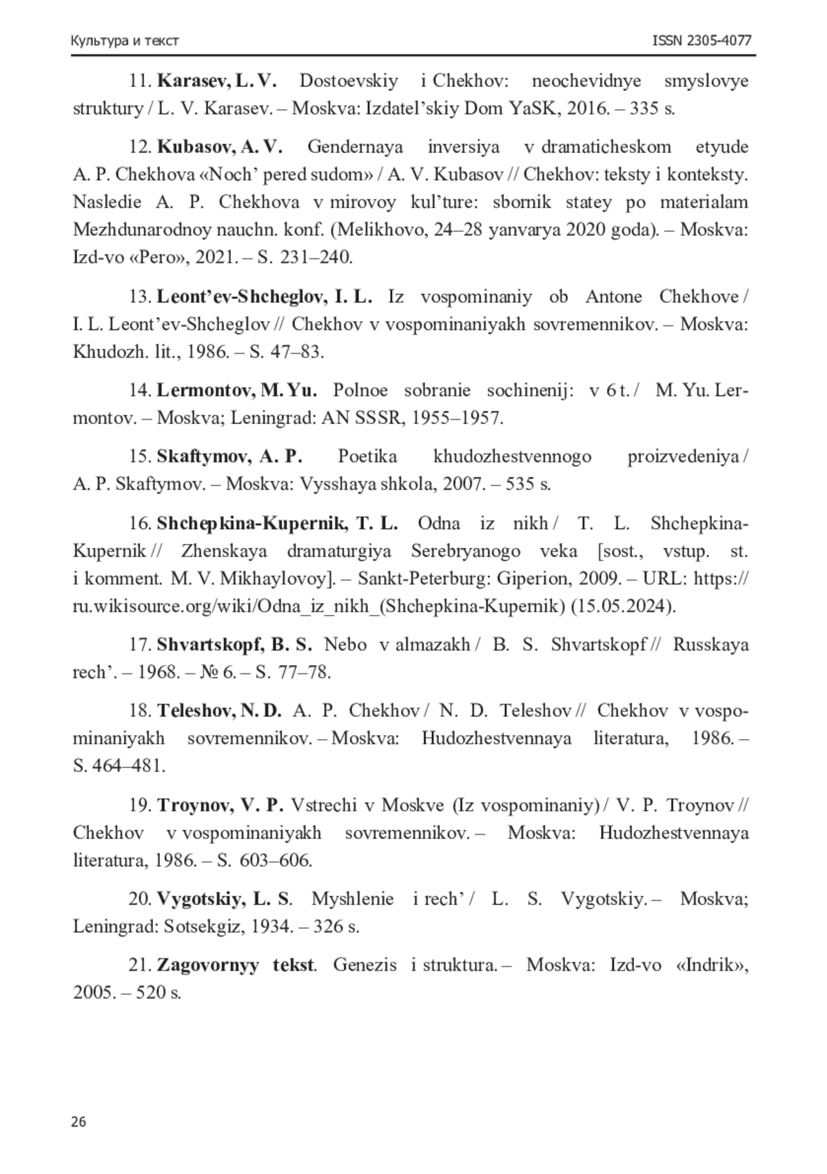 13. Кубасов, А. В. Гендерная инверсия в драматическом этюде А. П. Чехова “Ночь перед судом” / А. В. Кубасов // Чехов: тексты и контексты. Наследие А. П. Чехова в мировой культуре: сборник статей по материалам Международной научн. конф. (Мелихово, 24-28 января 2020 года). - Москва: Изд-во “Перо”, 2021. - С. 231-240.