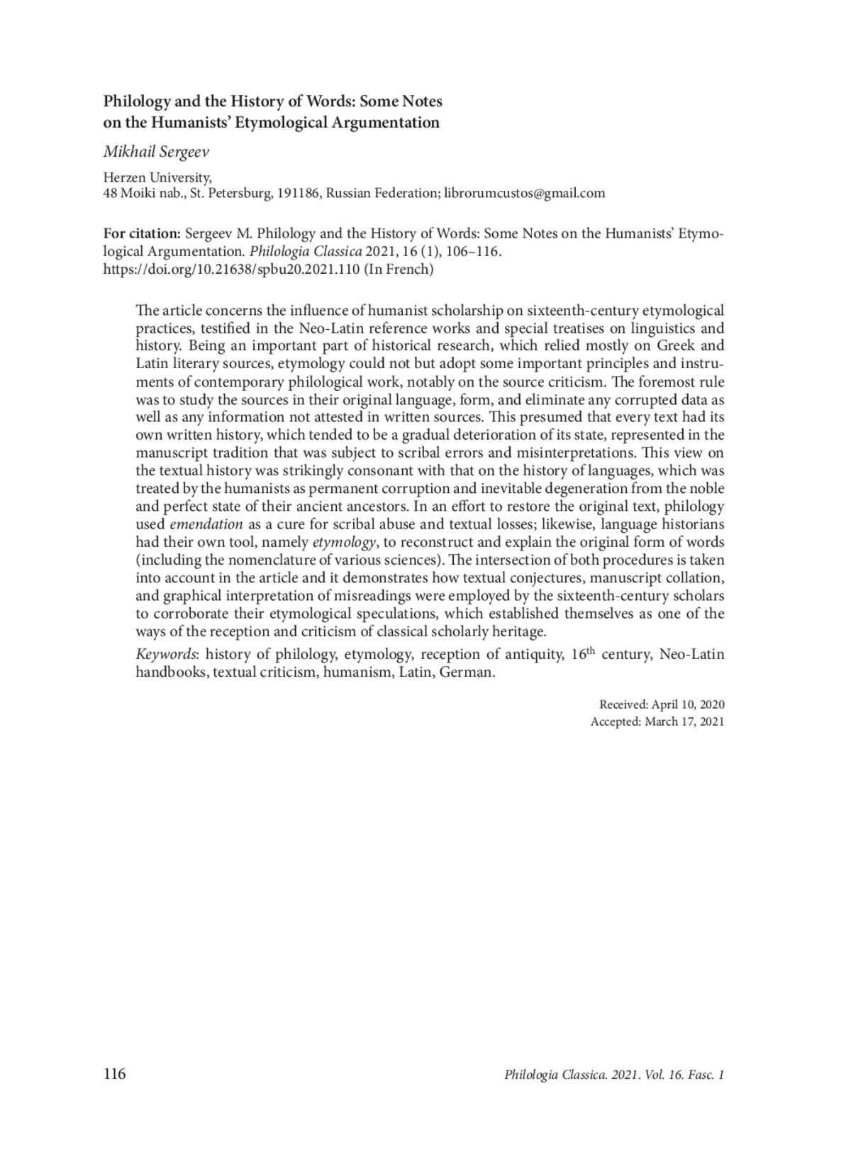 55. Sergeev M. L. History of a Written Word: on some Principles of 16th century Etymology. Journal of applied linguistics and lexicography 2019, 1 (2), 409-415. (In Russian). EDN: PCGWRJ