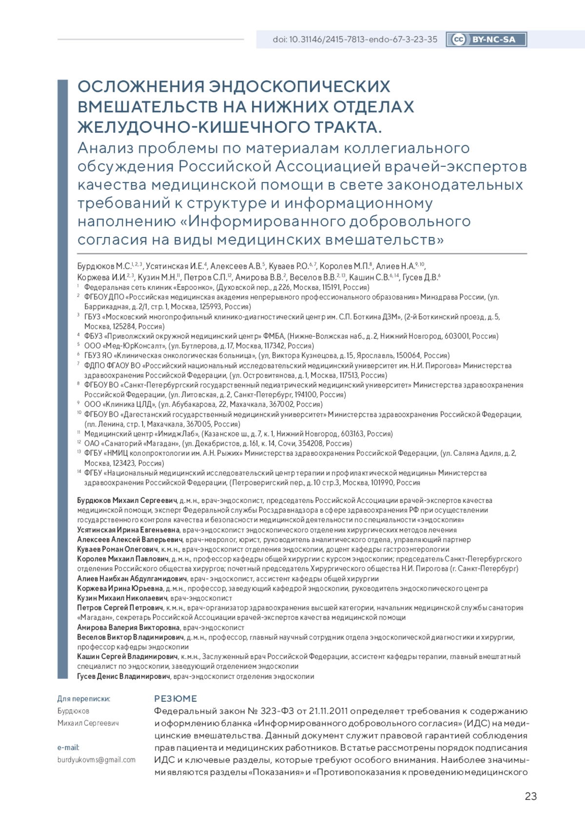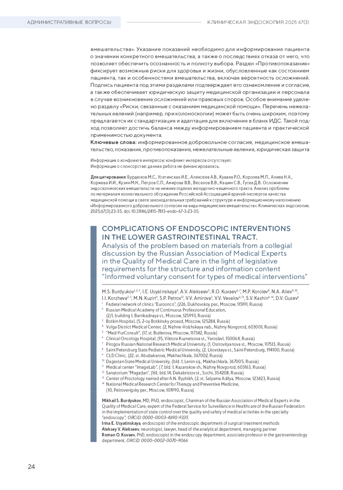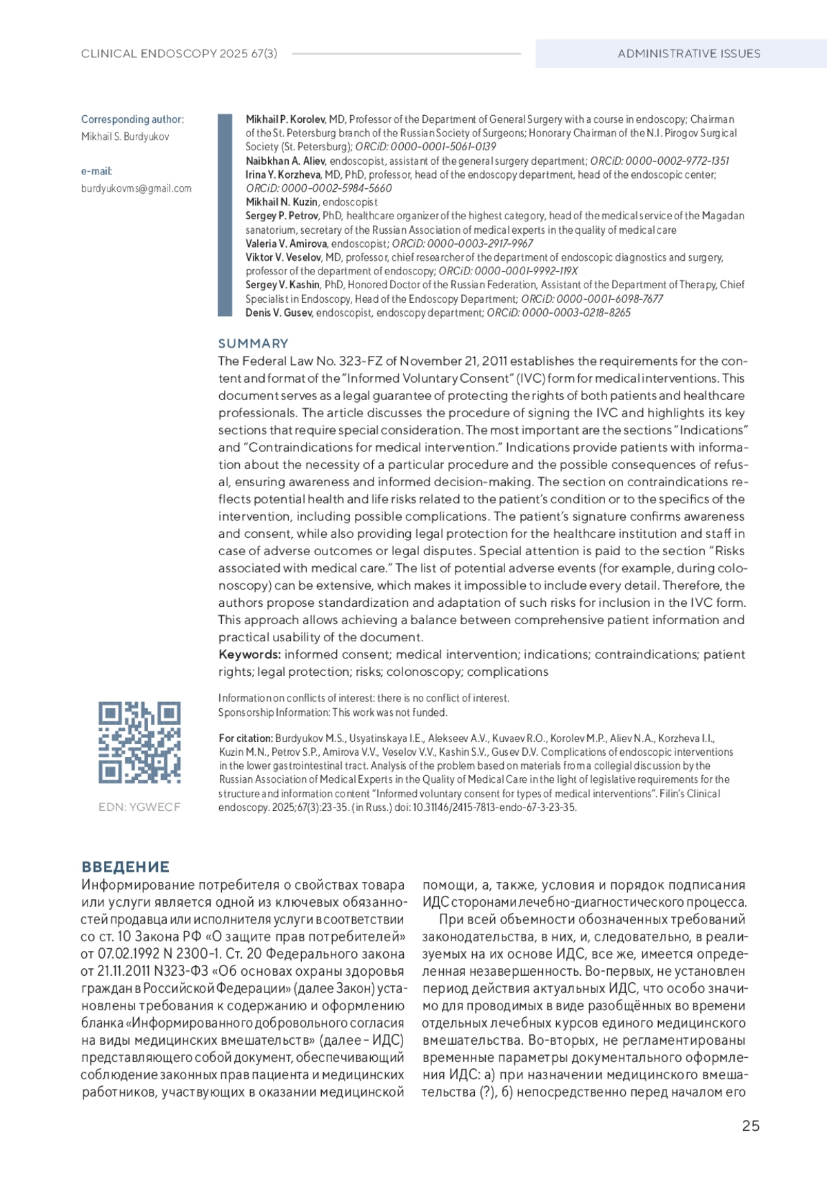 Федеральный закон № 323-ФЗ от 21.11.2011 определяет требования к содержанию и оформлению бланка «Информированного добровольного согласия» (ИДС) на медицинские вмешательства. Данный документ служит правовой гарантией соблюдения прав пациента и медицинских работников. В статье рассмотрены порядок подписания ИДС и ключевые разделы, которые требуют особого внимания. Наиболее значимыми являются разделы «Показания» и «Противопоказания к проведению медицинского вмешательства». Указание показаний необходимо для информирования пациента о значении конкретного вмешательства, а также о последствиях отказа от него, что позволяет обеспечить осознанность и полноту выбора. Раздел «Противопоказания» фиксирует возможные риски для здоровья и жизни, обусловленные как состоянием пациента, так и особенностями вмешательства, включая вероятность осложнений. Подпись пациента под этими разделами подтверждает его ознакомление и согласие, а также обеспечивает юридическую защиту медицинской организации и персонала в случае возникновения осложнений или правовых споров. Особое внимание уделено разделу «Риски, связанные с оказанием медицинской помощи». Перечень нежелательных явлений (например, при колоноскопии) может быть очень широким, поэтому предлагается их стандартизация и адаптация для включения в бланк ИДС. Такой подход позволяет достичь баланса между информированием пациента и практической применимостью документа.